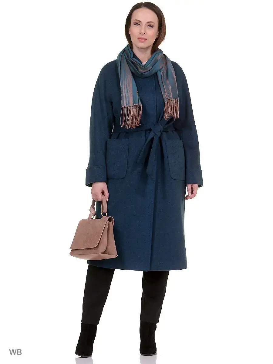 Однобортное пальто полуприлегающего силуэта длиной до колен. Цельнокроенный рукав с отворотом, отложной воротник, накладные карманы, пояс из основной ткани. Застежка на скрытые кнопки. Декорировано брошью и дополнено шарфом в тон.