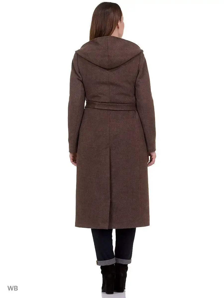 Двубортное пальто прилегающего силуэта длиной чуть ниже колена. Втачной рукав, большой капюшон, накладные карманы, пояс из основной ткани. Застежка на скрытые кнопки.
