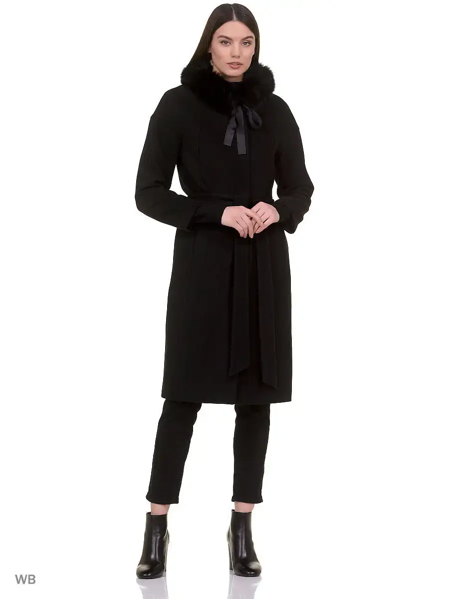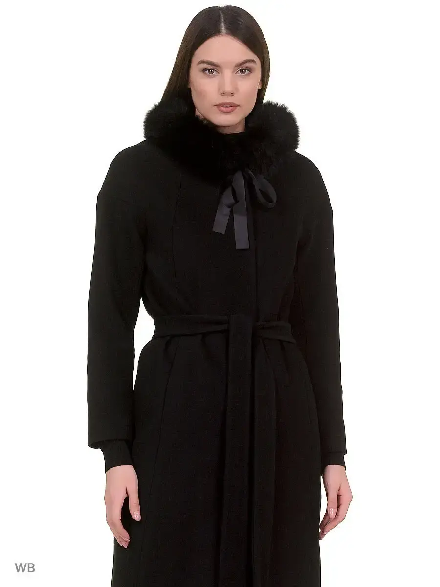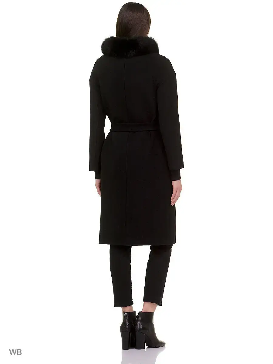 Двубортное пальто приталенного силуэта длиной чуть ниже колена. Втачный спущенный рукав, воротник-стойка, карманы-листочки, пояс из основной ткани. Застежка на скрытые кнопки. Изделие декорировано меховым съемным воротником с лентой в тон и тамбурной строчкой. Мех натуральный песец.