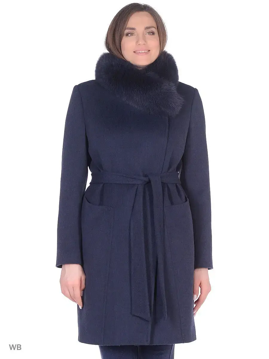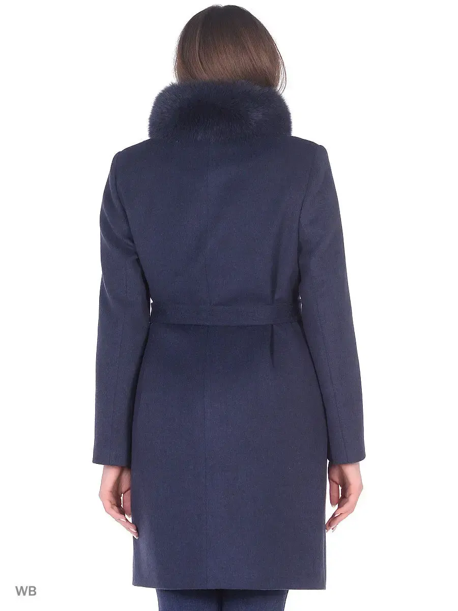 Двубортное пальто прямого силуэта длиной чуть выше колена. Втачной рукав, воротник-стойка, накладные карманы. Застежка на скрытые кнопки. Борта полочек скошены к низу изделия. Декорировано брошью, тамбурной строчкой и сьёмным натуральным мехом (песец).