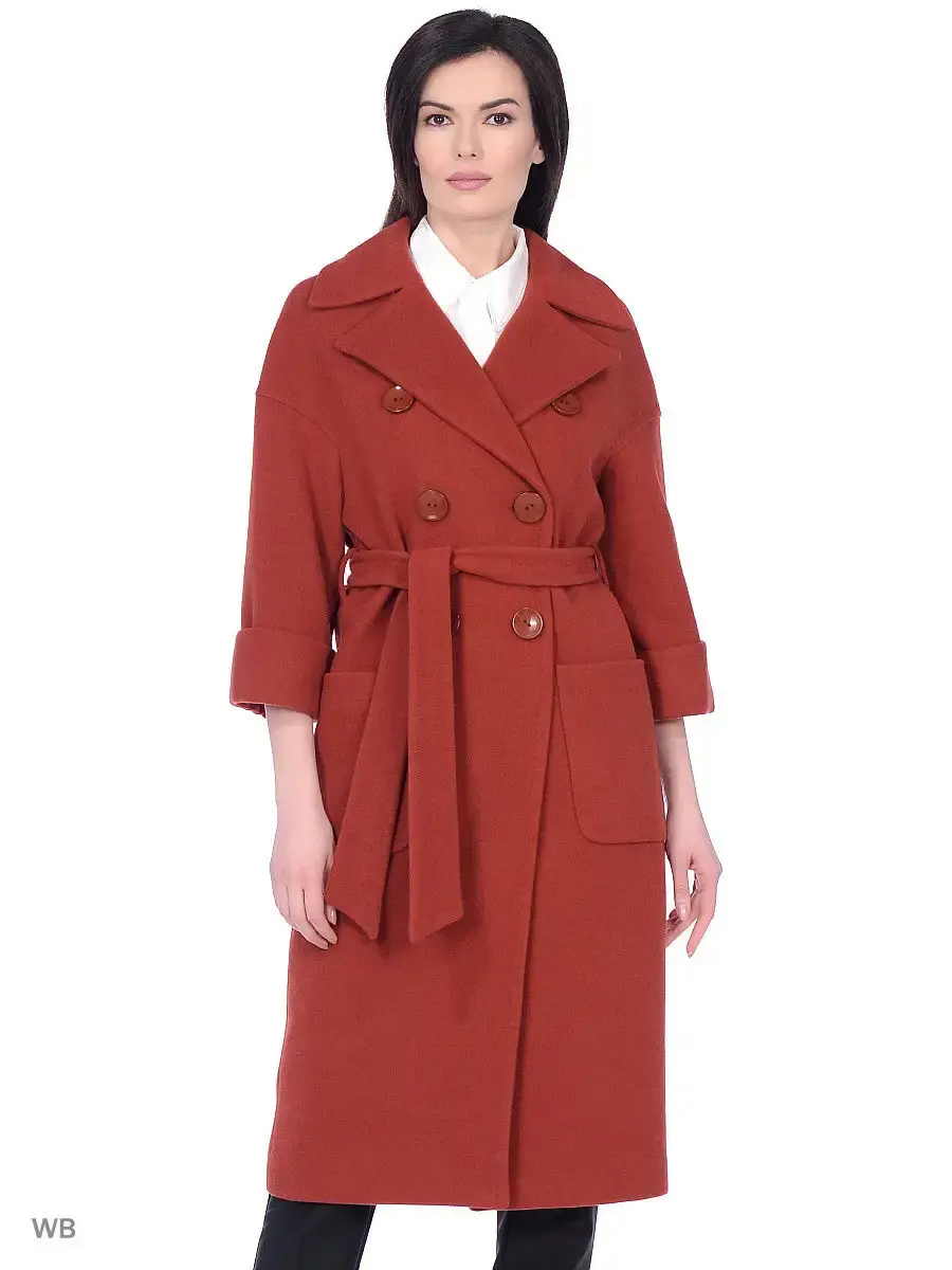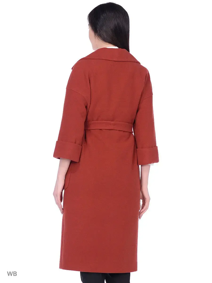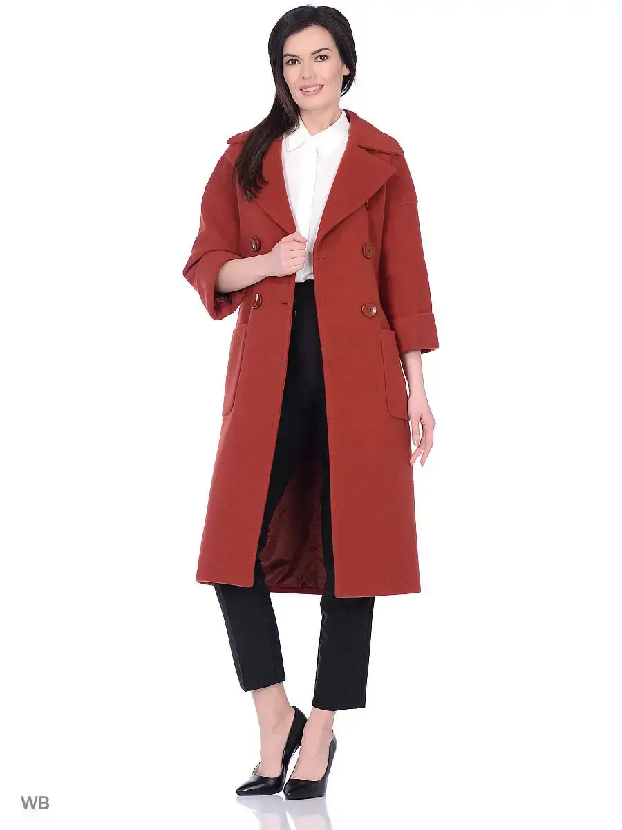 Двубортное пальто-кокон длиной чуть ниже колена. Втачный спущенный рукав длиной 3/4 с отворотом, широкий английский воротник, накладные карманы, пояс из основной ткани. Борт полочки скошен к низу изделия. Застежка на крупные пуговицы. Изделие декорировано тамбурной строчкой.