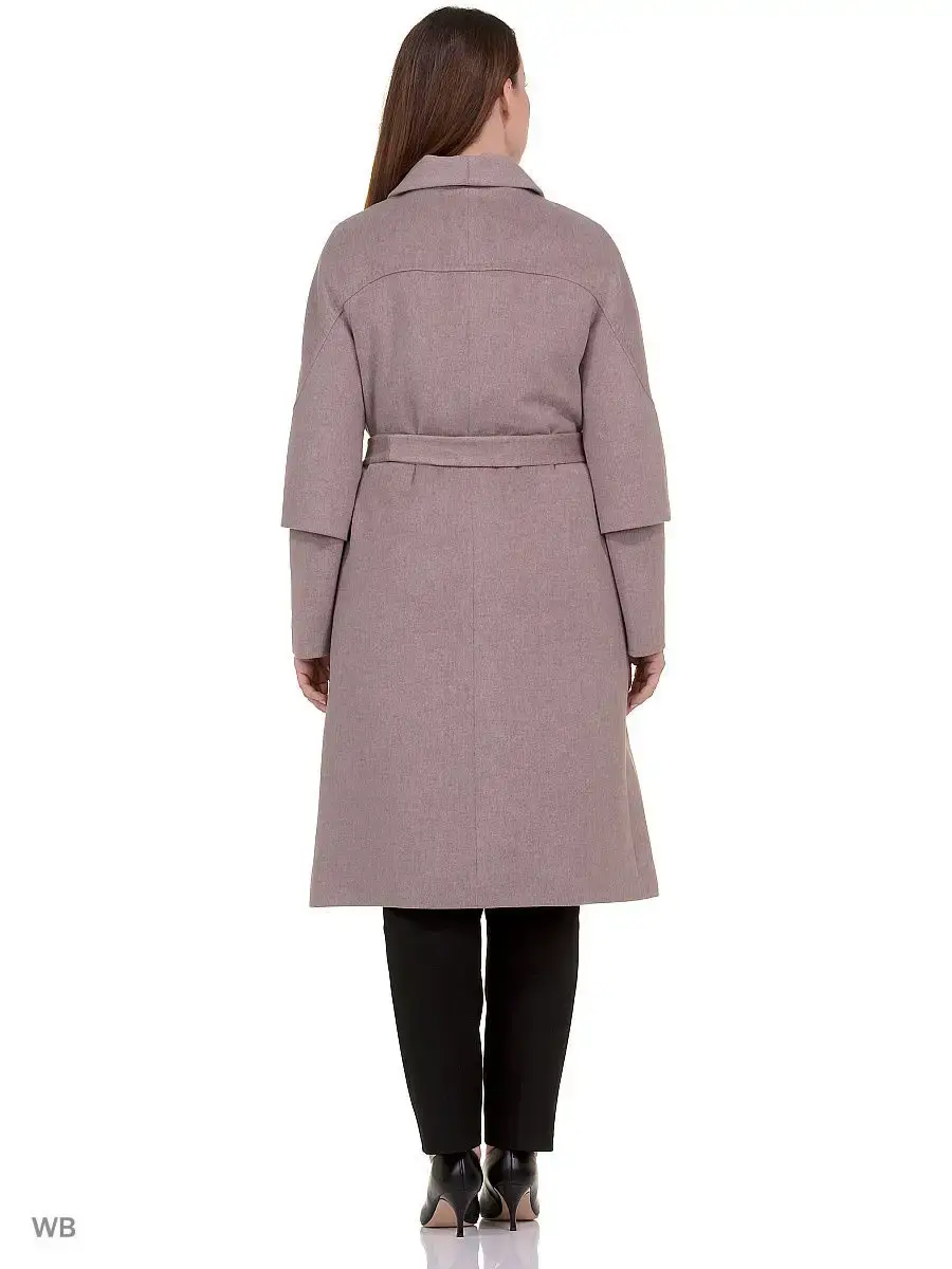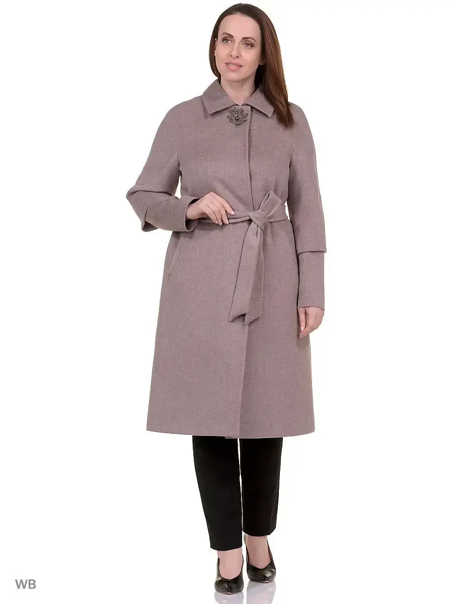 Однобортное пальто А-силуэта длиной до середины икры. Рукав-реглан длиной 3/4 дополнен съемным внутренним рукавом, отложной съемный воротник, карманы-листочки. Застежка на скрытые кнопки. Декорировано горизонтальным волнистым отрезом, проходящим через рукава и полочки. Украшено брошью.