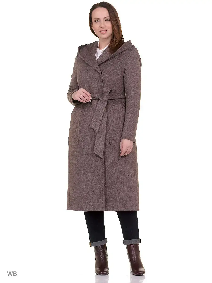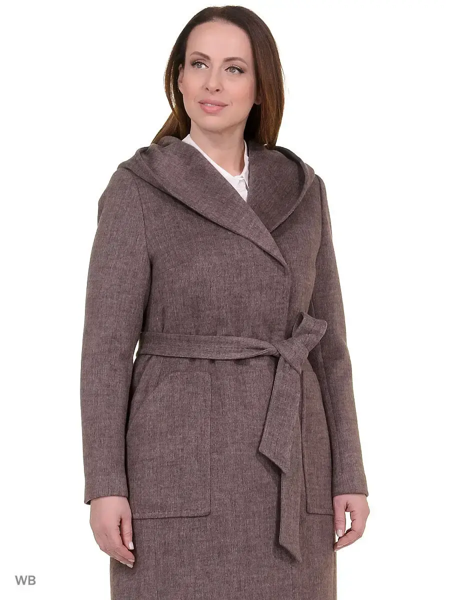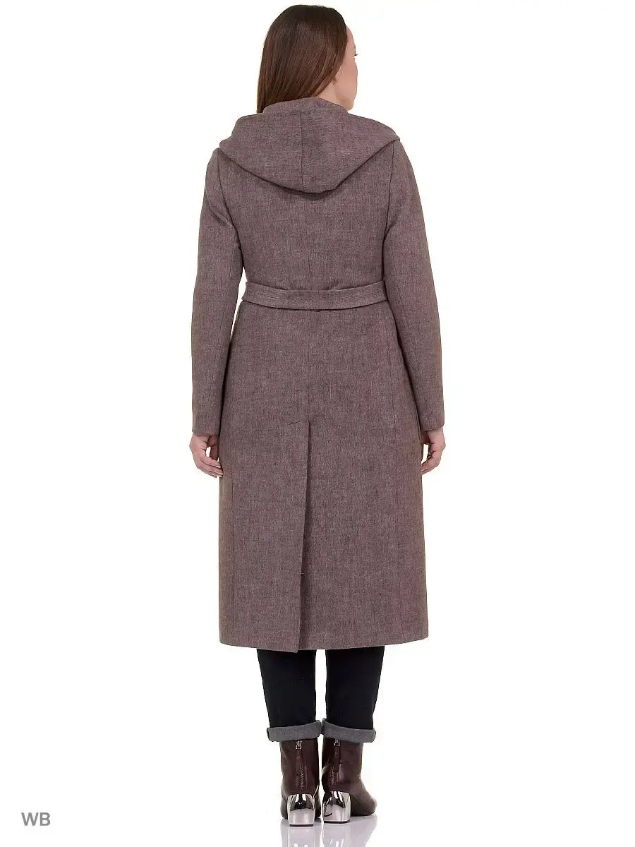 Двубортное пальто прилегающего силуэта длиной чуть ниже колена. Втачной рукав, большой капюшон, накладные карманы, пояс из основной ткани. Застежка на скрытые кнопки.