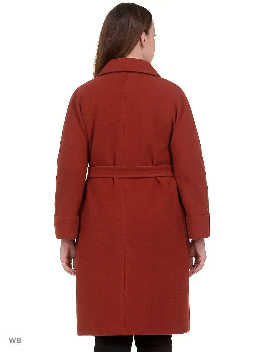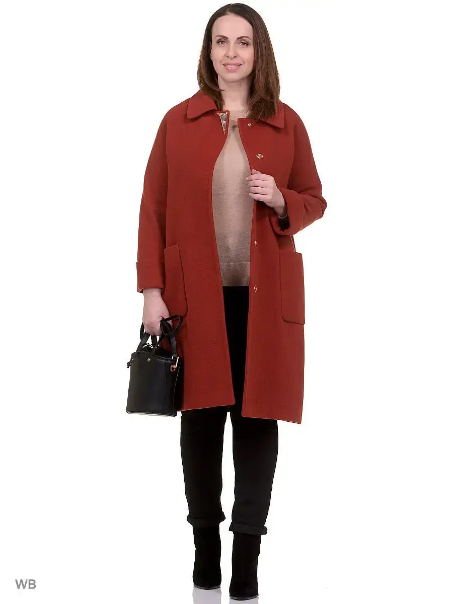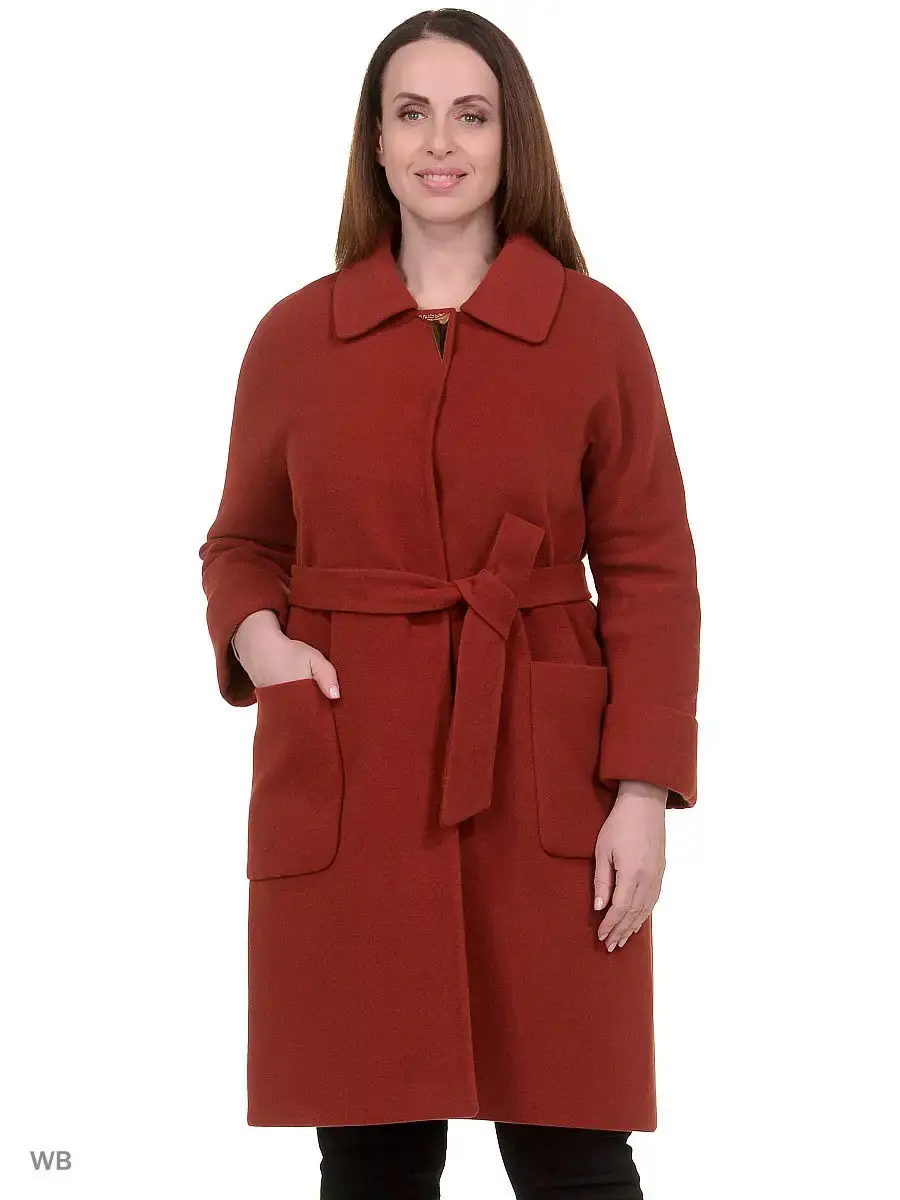 Однобортное пальто прямого силуэта длиной до колена из ворсовой ткани. Цельнокроенный рукав с отворотом, отложной воротник, накладные карманы, застежка на скрытые кнопки, пояс из основной ткани. Декорировано брошью.