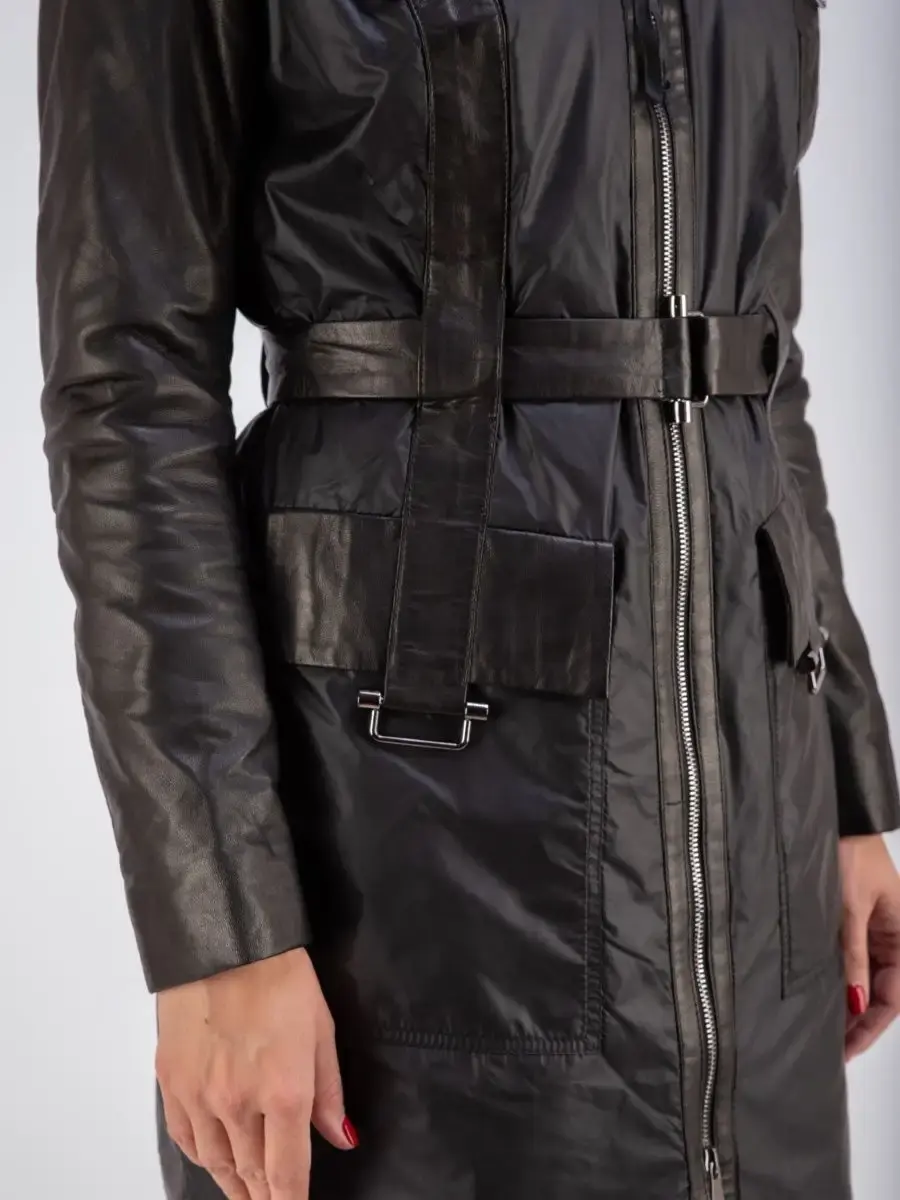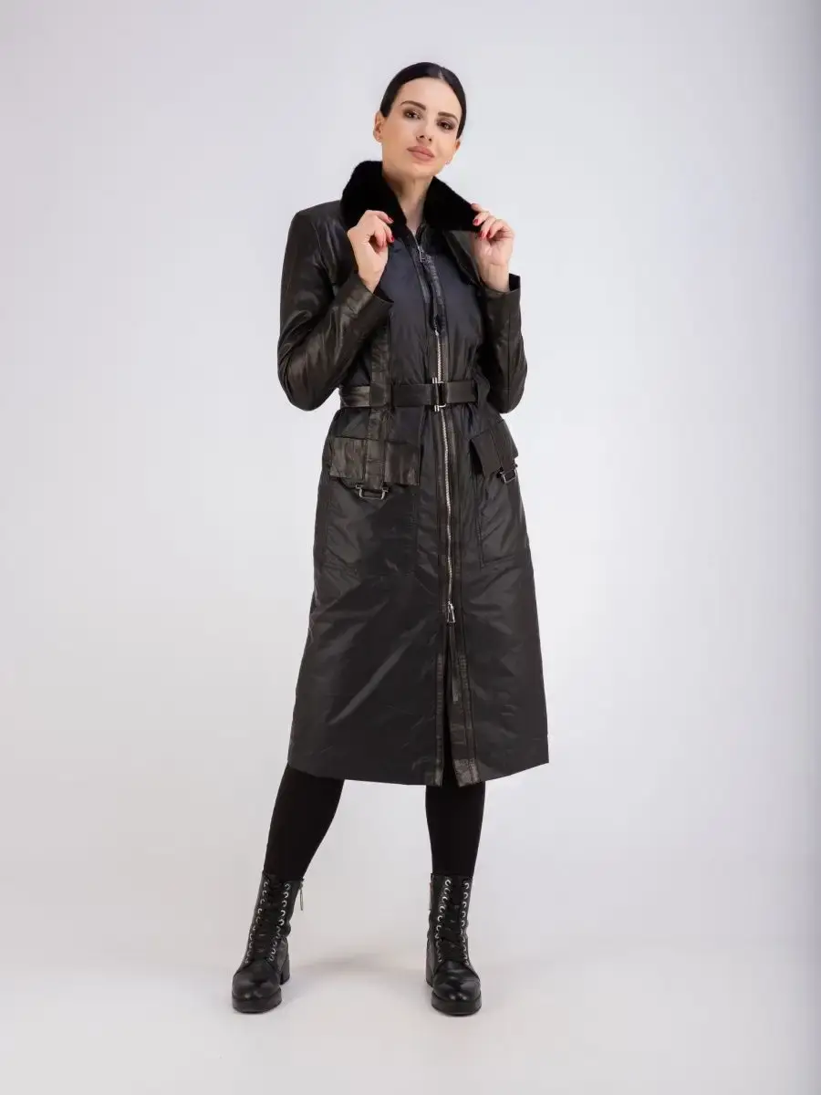Пальто женское весна - осень, плащ женский тренчкот комбинированный из натуральной кожи и ткани. Пальто демисезонное женское, тренч женский с застежкой на молнии.