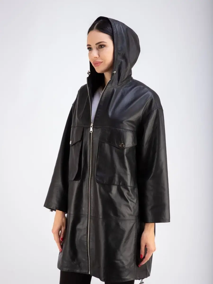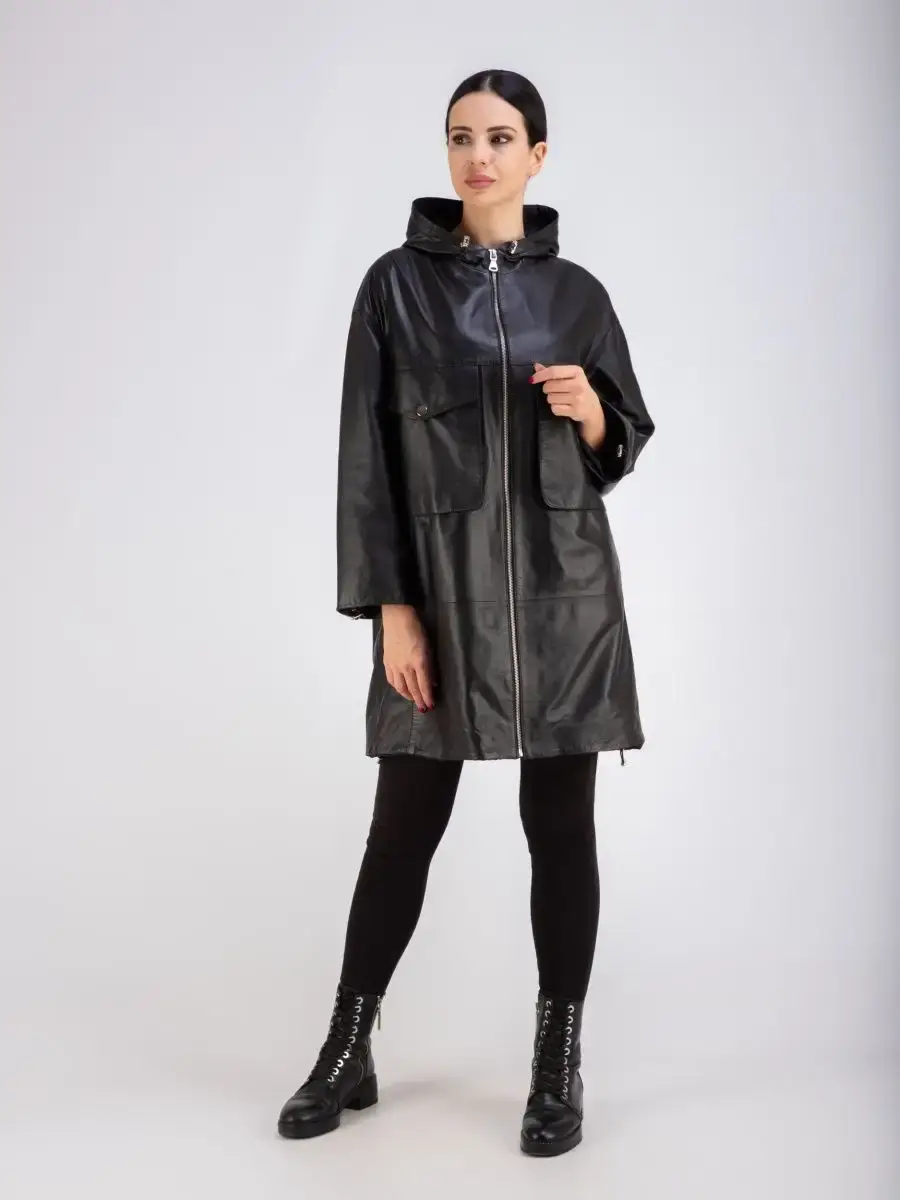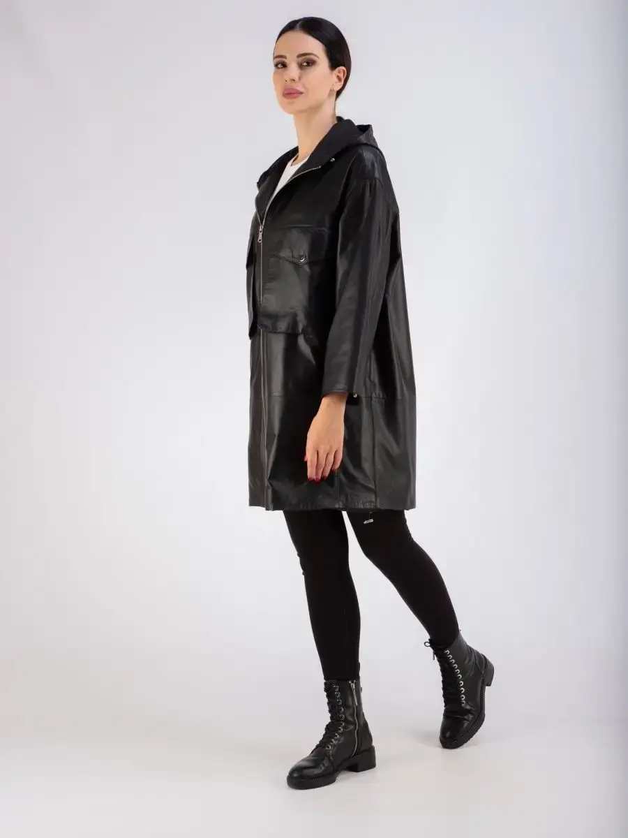 Женское пальто из натуральной кожи ягненка оверсайз, большие размеры. Удлиненная женская куртка - пальто женское кожаное из натуральной кожи ягненка с застежкой на молнии замечательный выбор, если вы намерены не только чувствовать себя комфортно, но и хотите выглядеть стильно и модно. Пальто свободного - прямого кроя, не сковывает движения. Пальто, плащ из натуральной кожи премиум качества со спущенной линией плеча, с накладными карманами на груди и с прорезными по бокам. Сочетание дизайна с долговечностью, драгоценностью и мягкостью натуральной кожи делает пальто женское, плащ женский, куртки кожаные идеальным предметом женской одежды. Пальто женское весна - осень больших размеров с кулисками прекрасно подходить для холодных дней весной, осенью и летом. Кожаное пальто, плащ кожаный женский прекрасно впишется практически в любой стиль - повседневный, городской, офисный и вечерний. Свободный крой пальто оверсайз, утягивающие кулиски на рукавах и на капюшоне, спущенная линия плеч и укороченный рукав позволяет носить девушкам и женщинам с любым типом фигуры.