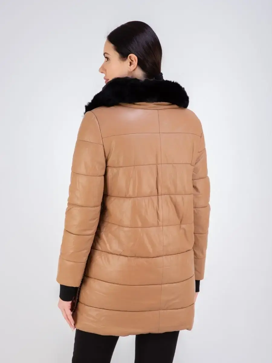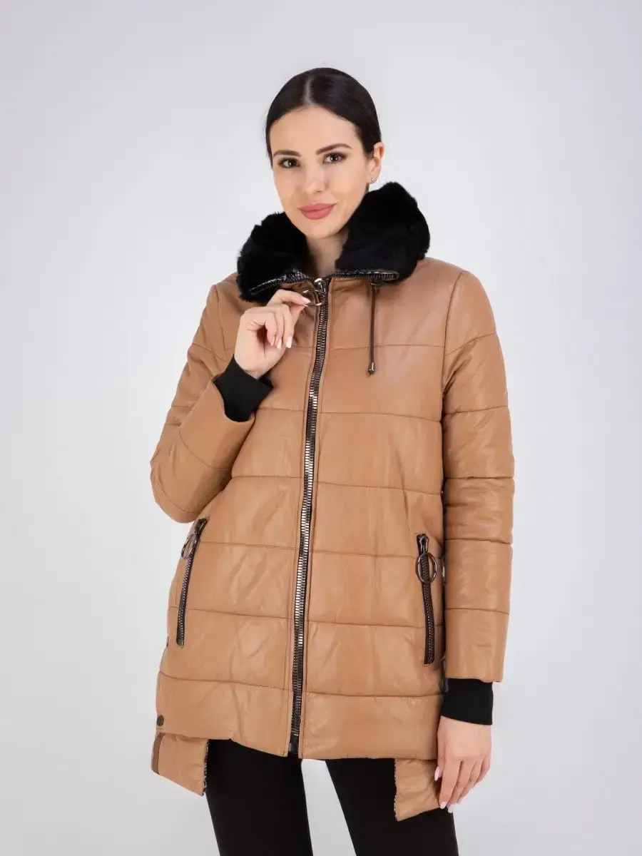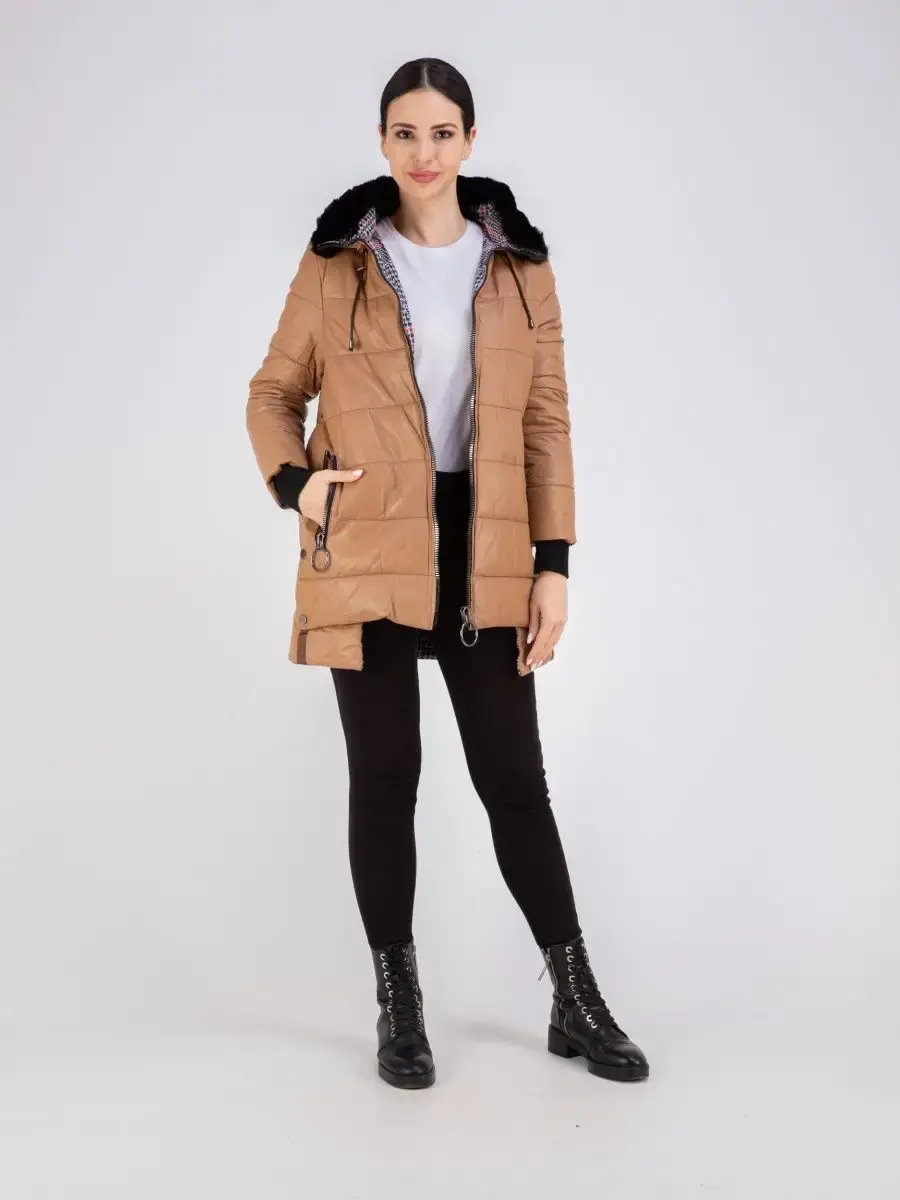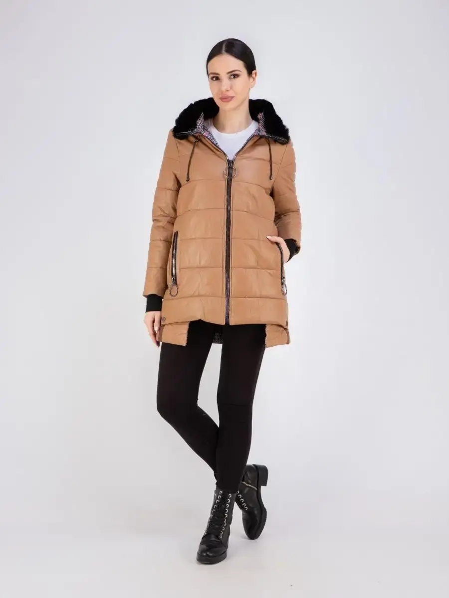 Женское пальто из гладкой натуральной кожи, куртка женская стеганая удлиненная. Кожаная куртка длинная с застежкой на молнии, с прорезными карманами и с разрезом по бокам на кнопках. Пальто утепленное на синтепоне. Утепленная куртка женская, пальто стеганое отлично защитит от ветра и дождя, хороший вариант на каждый день и сезон, сочетается с различными вещами, прекрасно впишется практически в любой стиль - повседневный, городской, офисный и вечерний. Мех кролика на воротнике, меховой воротник съемный, капюшон скрытый. Длина по спинке 80 см. Производства Турция.
