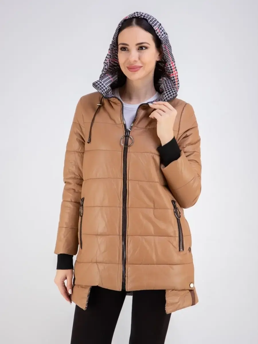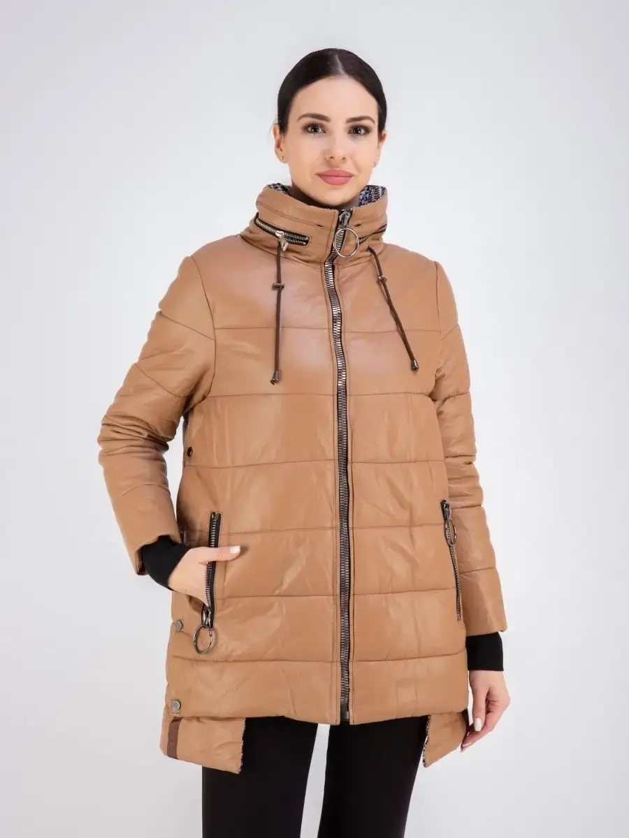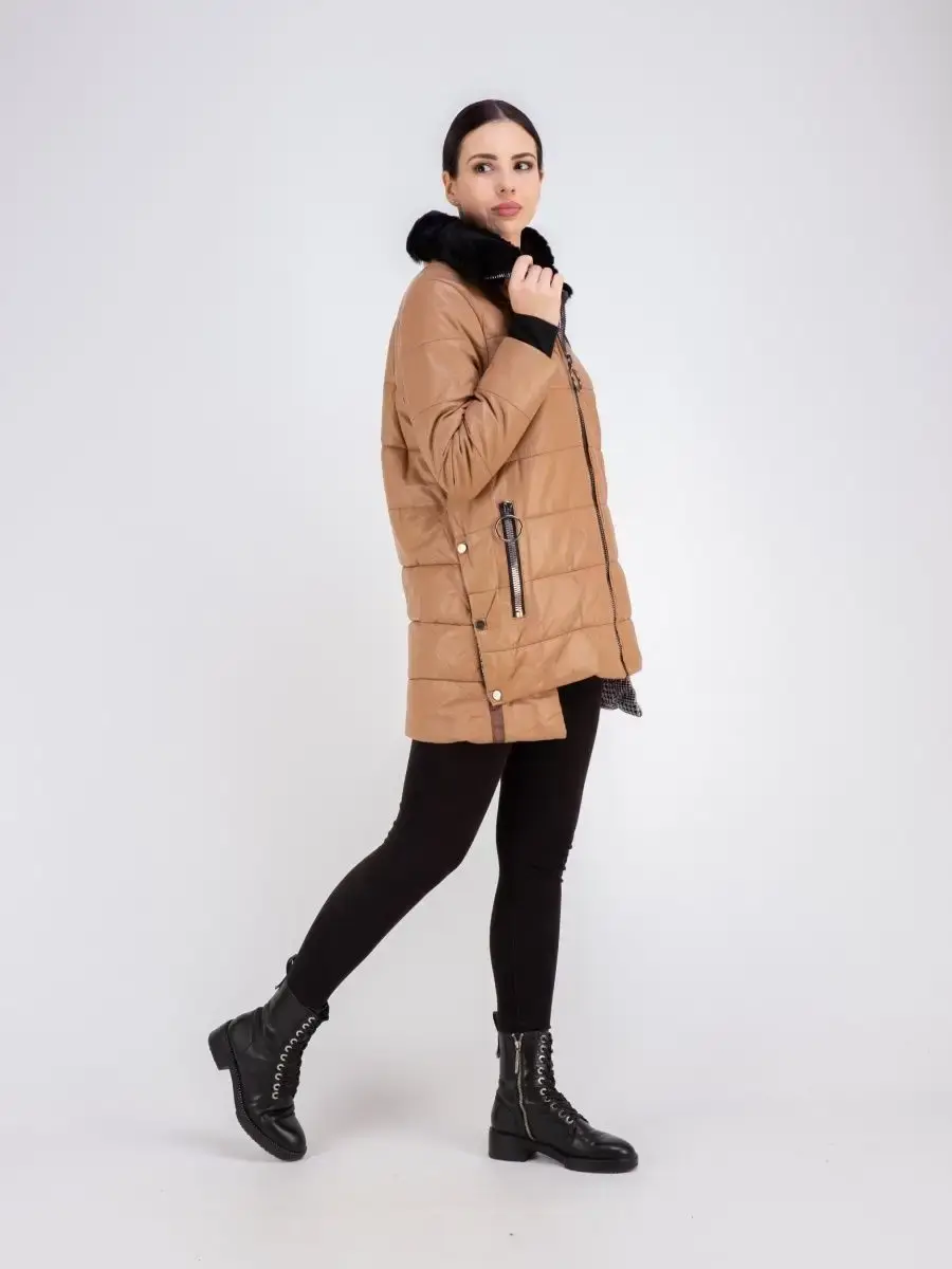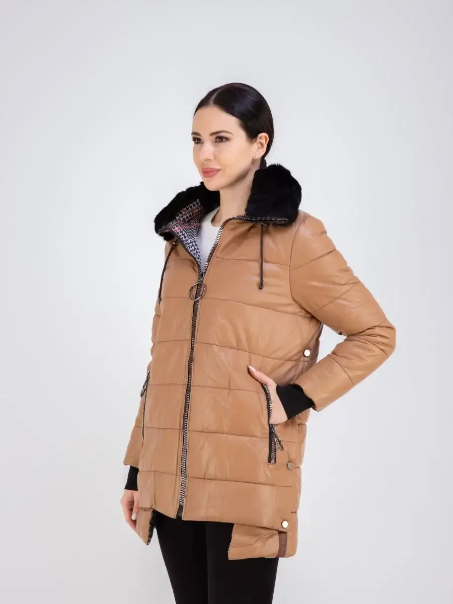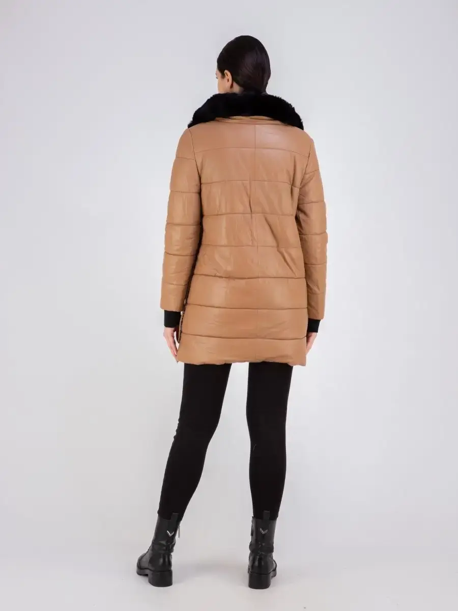 Женское пальто из гладкой натуральной кожи, куртка женская стеганая удлиненная. Кожаная куртка длинная с застежкой на молнии, с прорезными карманами и с разрезом по бокам на кнопках. Пальто утепленное на синтепоне. Утепленная куртка женская, пальто стеганое отлично защитит от ветра и дождя, хороший вариант на каждый день и сезон, сочетается с различными вещами, прекрасно впишется практически в любой стиль - повседневный, городской, офисный и вечерний. Мех кролика на воротнике, меховой воротник съемный, капюшон скрытый. Длина по спинке 80 см. Производства Турция.