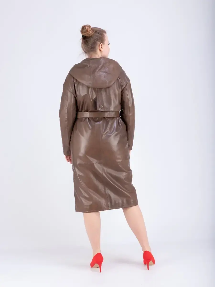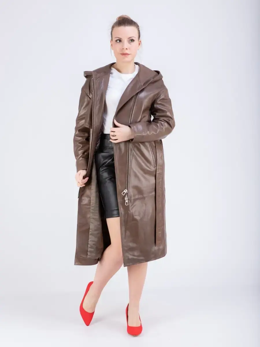 Длинный плащ женский на весну и на лето без утеплителя застегивается на молнию. Демисезонная модель, женский кожаный плащ имеет свободный прямой крой, длину ниже колена. Втачной рукав, не съемный капюшон, прорезные карманы, декоративная вставка на молнии и на пуговице и фурнитура добавляют акценты стиля и функциональности, делают это пальто женское красивым элементом гардероба, который подходит практически под любой стиль, деловой или повседневный.