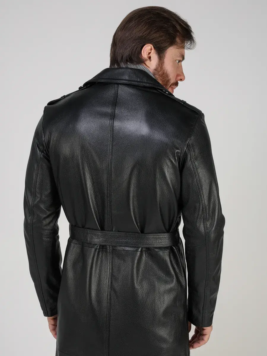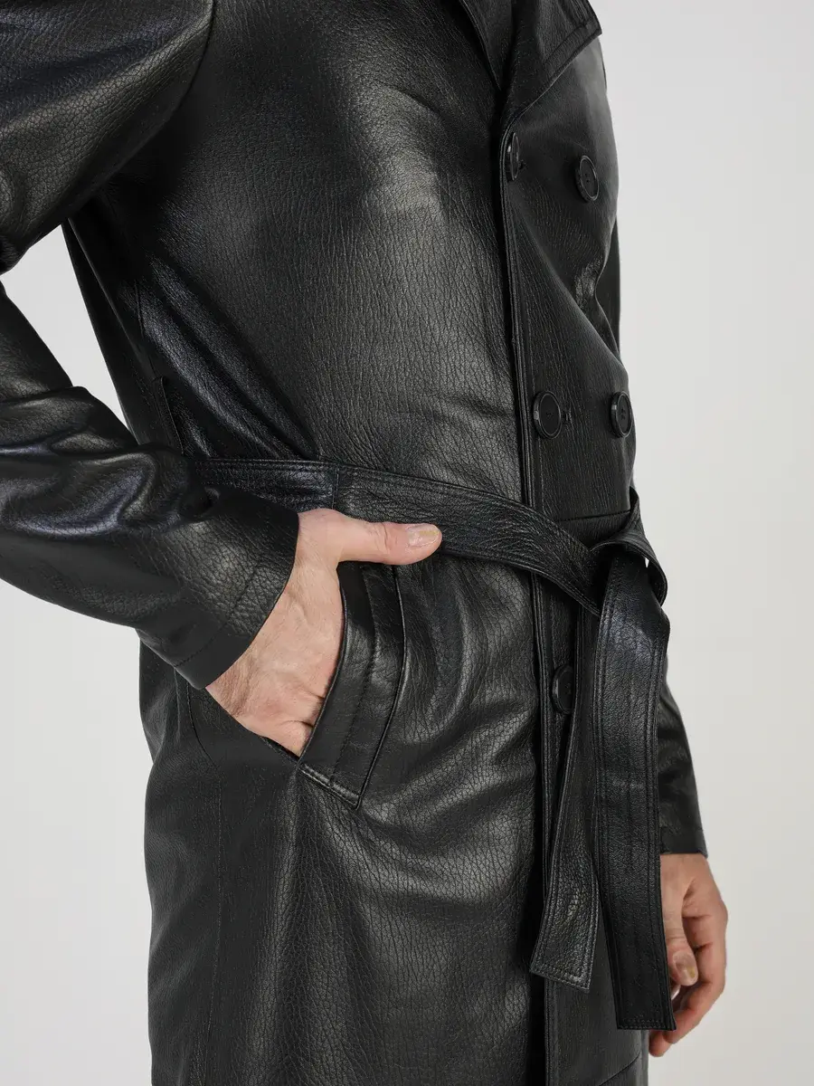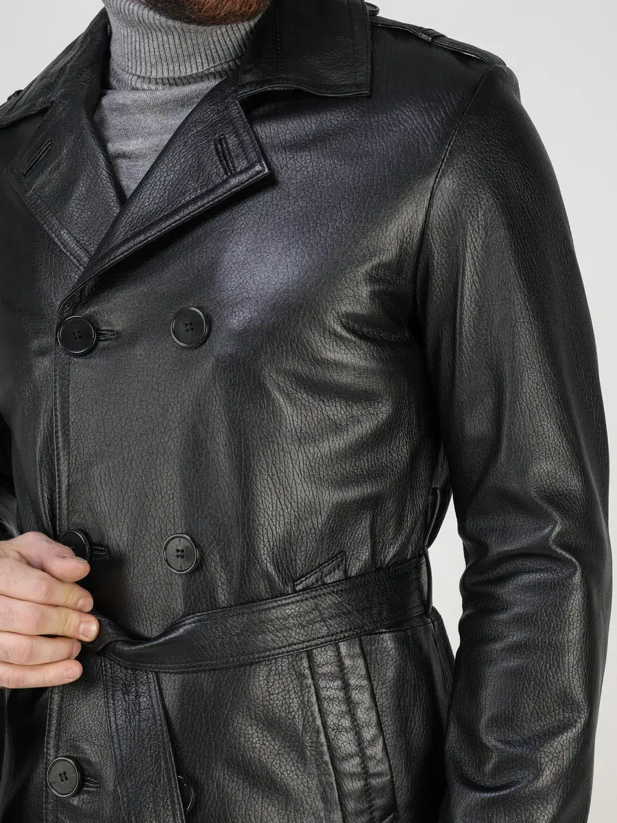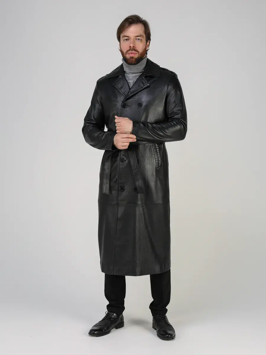 Классический двубортный крой с эполетами и шлицей придает плащу элегантный вид, подходящий как для офиса, так и для повседневной носки. Прорезные карманы удобны для хранения мелочей, а застежка на пуговицах обеспечивает надежную фиксацию. Кожаный плащ мужской длинный дополнен кожаным поясом, который делает изделие прямого свободного кроя приталенным.