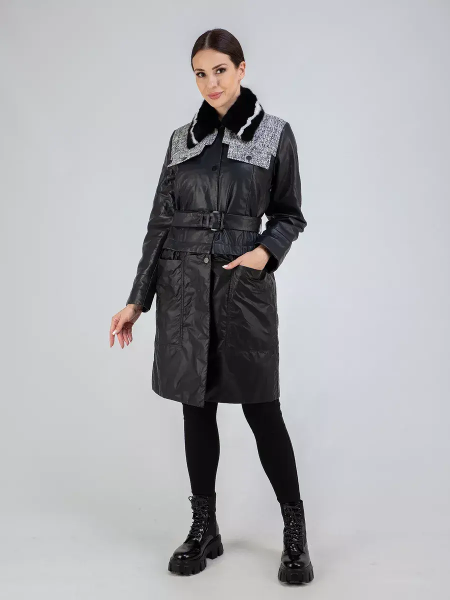 Элегантный кожаный плащ женский, пальто женское из натуральной кожи и плащевки - настоящая находка для стильных женщин, стремящихся выглядеть безупречно в любое время года. Плащ трансформер, низ можно отстегнут и носить как куртка женская. Стильная и практичная верхняя одежда для осени и весны. Плащ женский длинный изготовлен из высококачественной натуральной кожи и ткани, которая применяется для создания эксклюзивных модных коллекций верхней одежды. На воротнике съемный мех норки, на плечах вставки из трикотажа.
