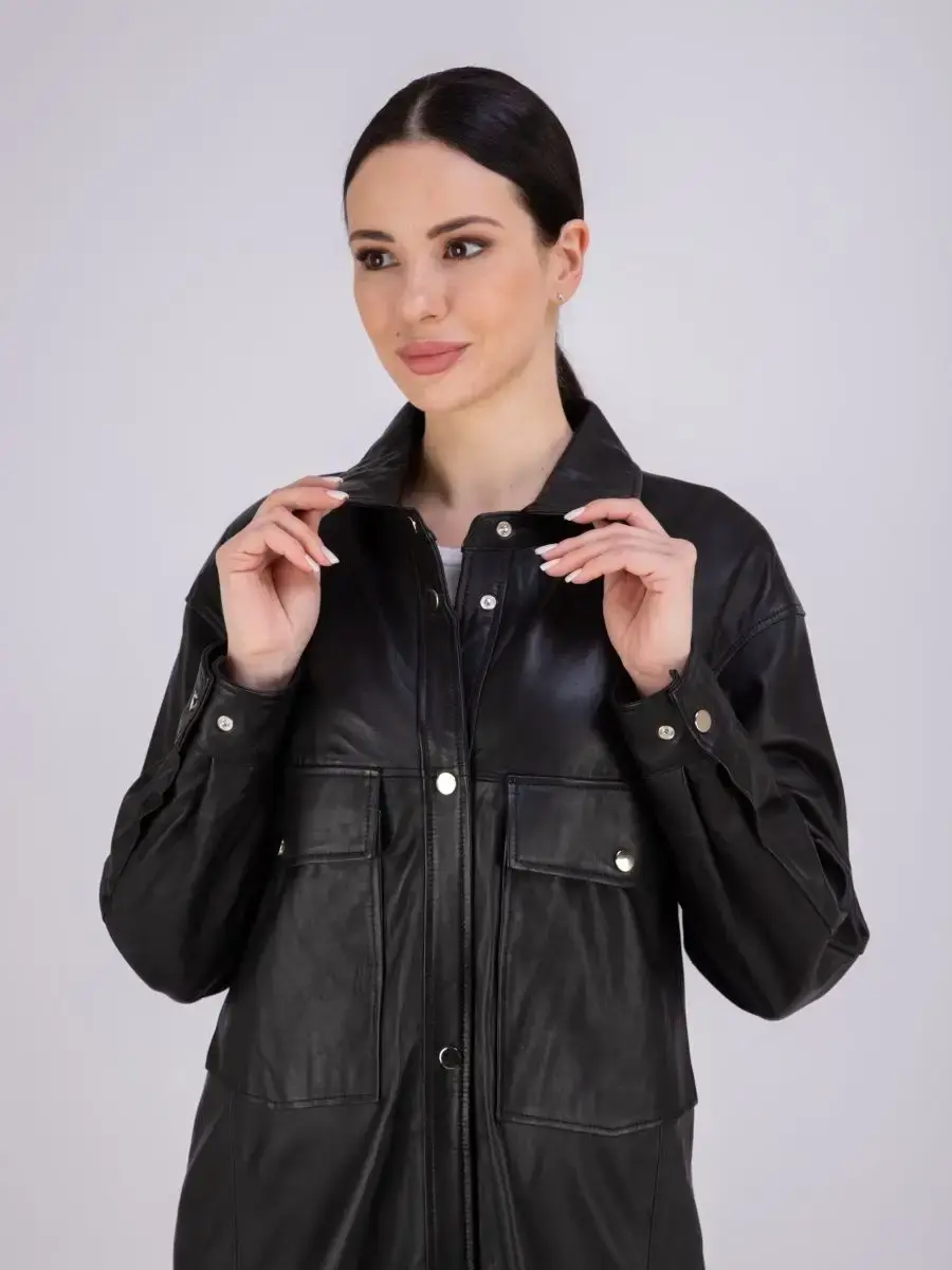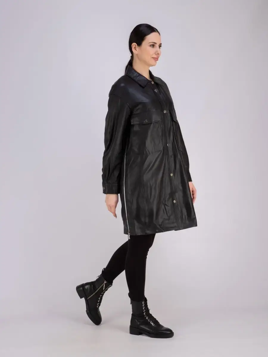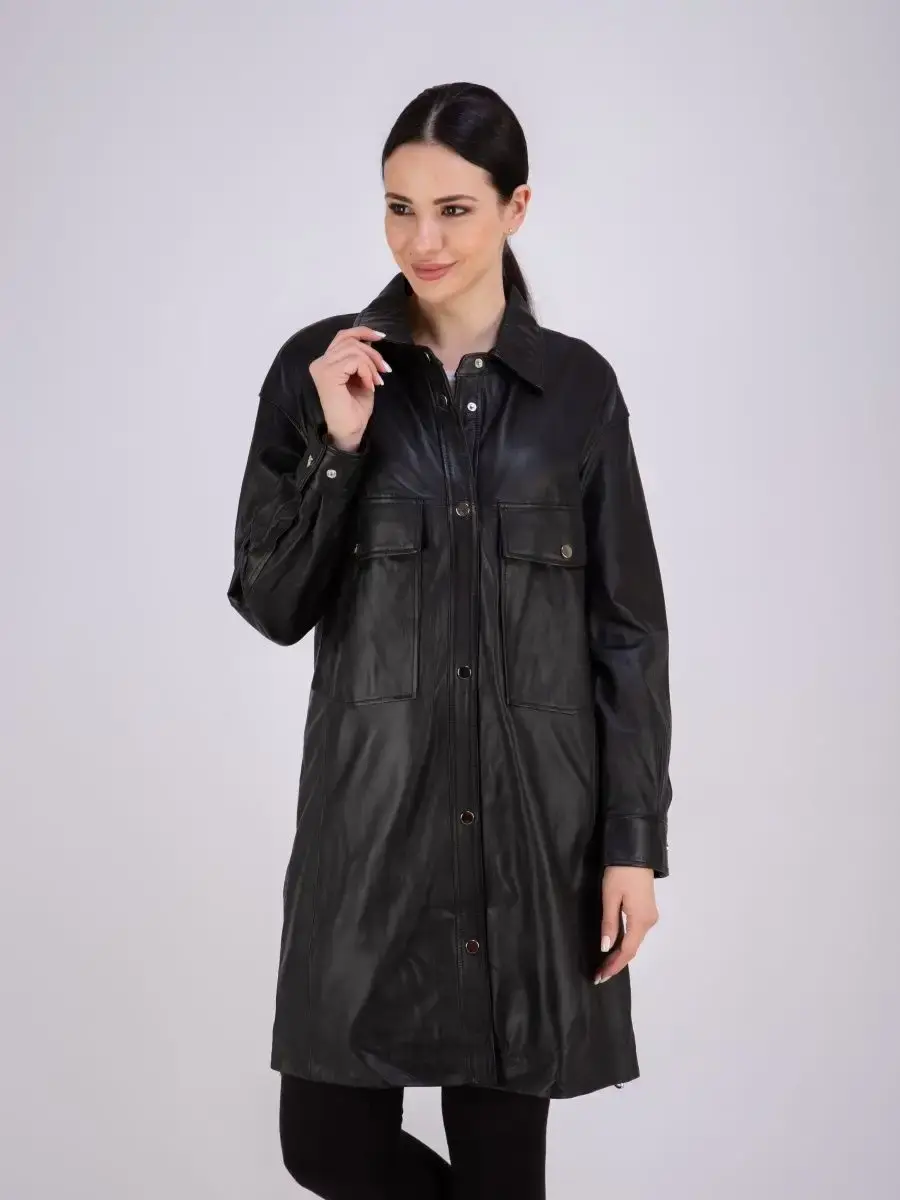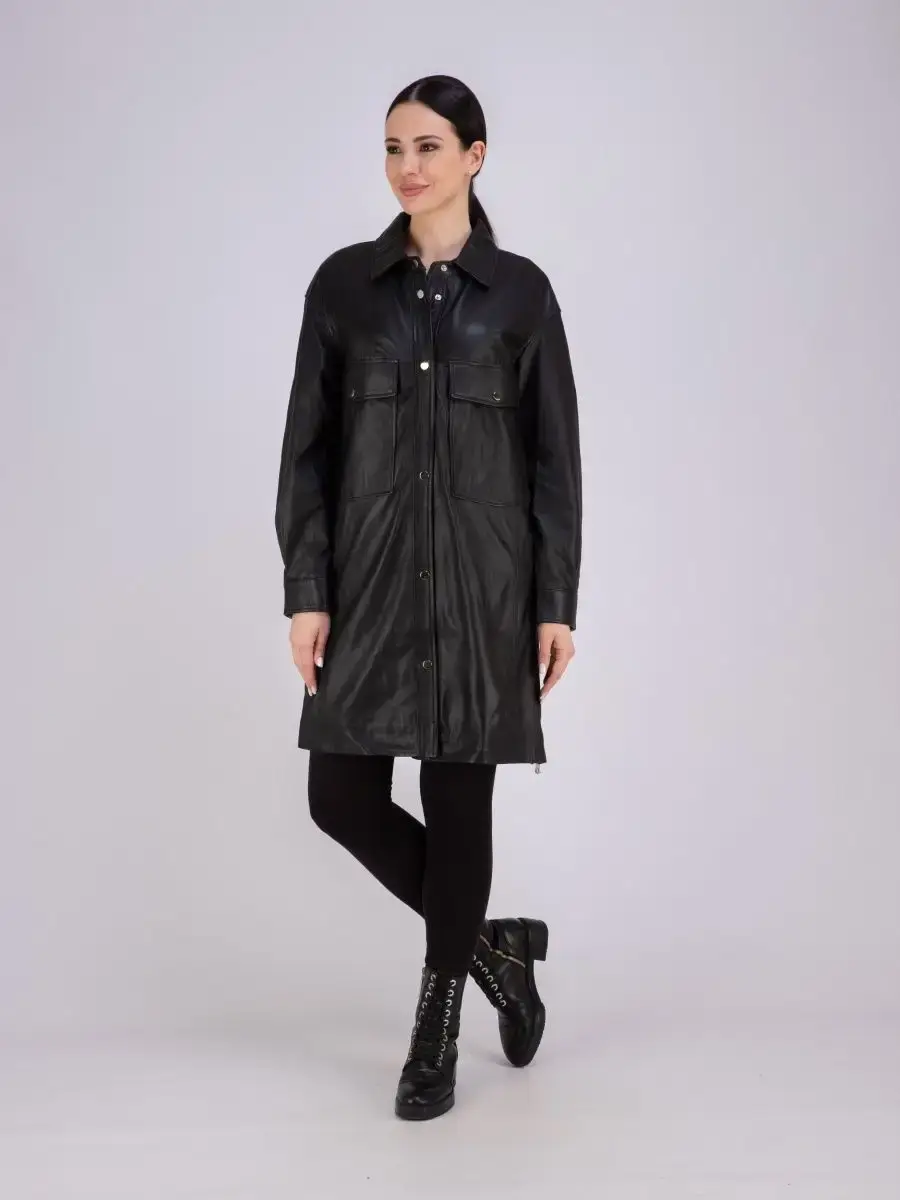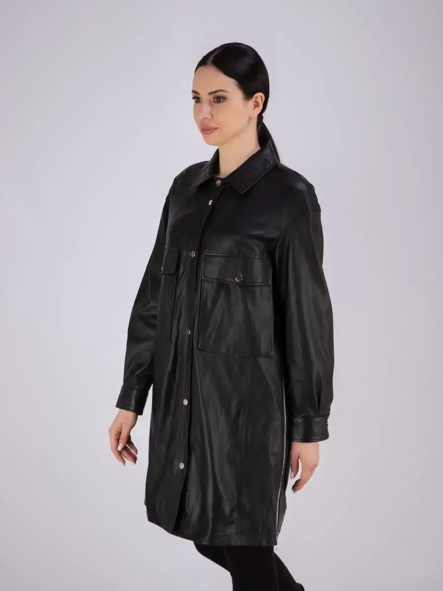 Плащ женский кожаный - длинная кожаная рубашка женская из 100% высококачественной натуральной кожи. Элегантный плащ кожаный женский, удлиненная рубашка кожаная женская с застежкой на кнопках с шлицами на молнии по бокам принесет Вам тепло и комфорт в любое время года. Стильный кожаный плащ женский прямого кроя станет альтернативой тканевому. Демисезонный плащ выполнен из нежной кожи ягненка, которая защитит вас в любую непогоду. Модные накладные карманы с клапаном, рукав с манжетом на кнопках, воротник стойка - отложной делает этот плащ идеальной верхней одеждой на весну, осень и прохладное лето. Кожаный плащ прекрасно впишется практически в любой стиль — повседневный, городской, офисный и вечерний. Вы можете купить плащи женские, тренчкот, куртки женские, косухи, куртка женская, кожаная куртка, куртка демисезонная женская, куртка женская весна, куртки женские, куртка женская демисезонная, кожаная куртка женская, куртка кожаная женская, плащ женский длинный в подарок со скидкой на странице бренда MONDIAL! Коллекция обновляется каждый сезон. Длина по спинке 95см. Производство Турция