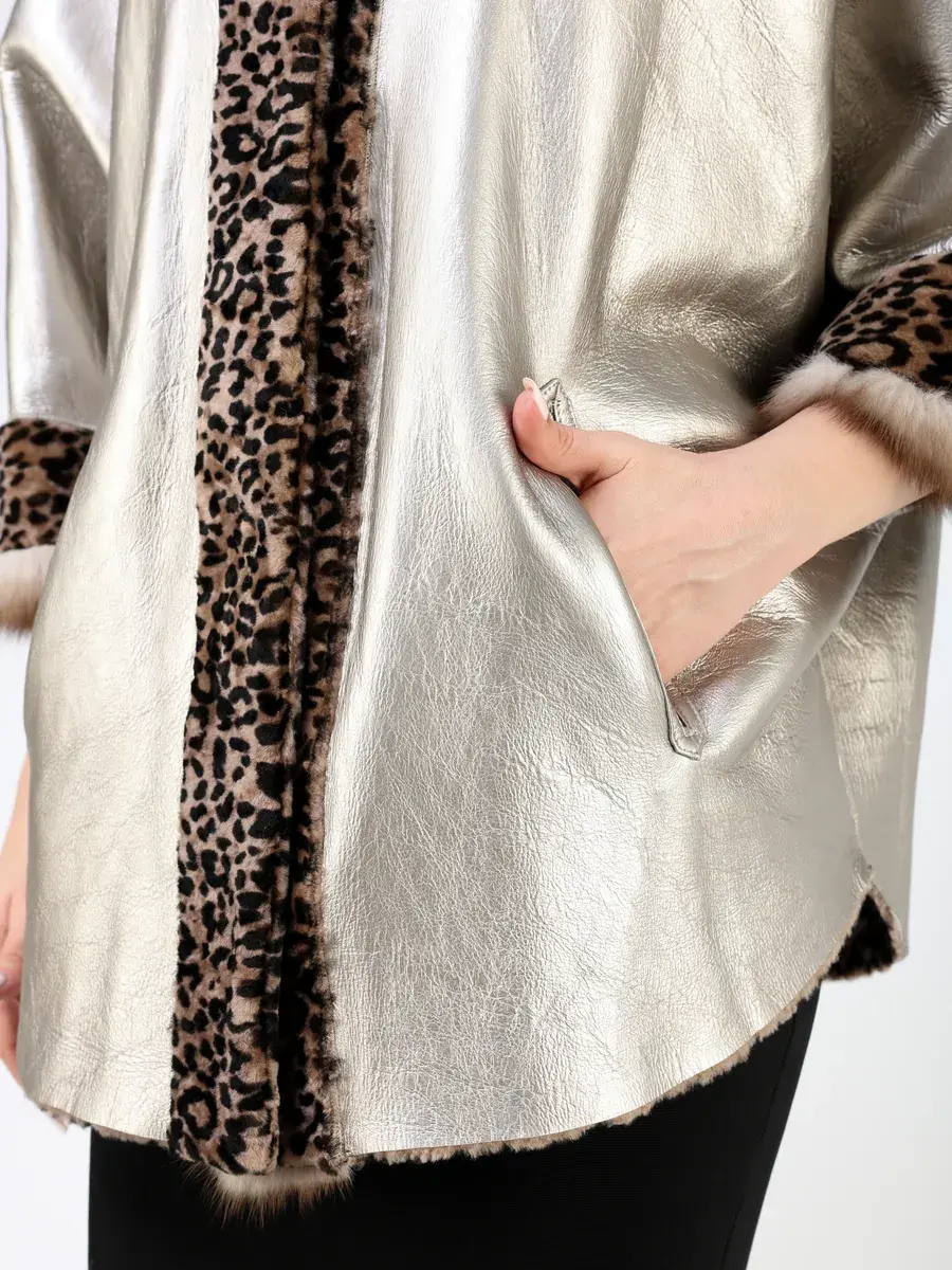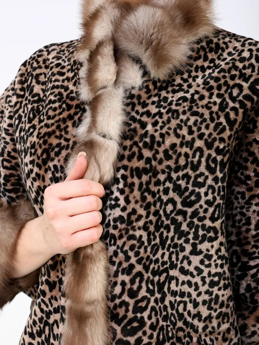 Особое внимание привлекает свободный - оверсайз крой, леопардовый цвет и мех куницы, которые делают модель модной и эксклюзивной. Двусторонняя шуба - дубленка с застежкой на кнопках имеет прорезные карманы, короткий рукав реглан и ассиметричную подол, которые позволяют свободно двигаться. Шубка длиной до бедра очень теплая, смотрится очень богато и дорого.