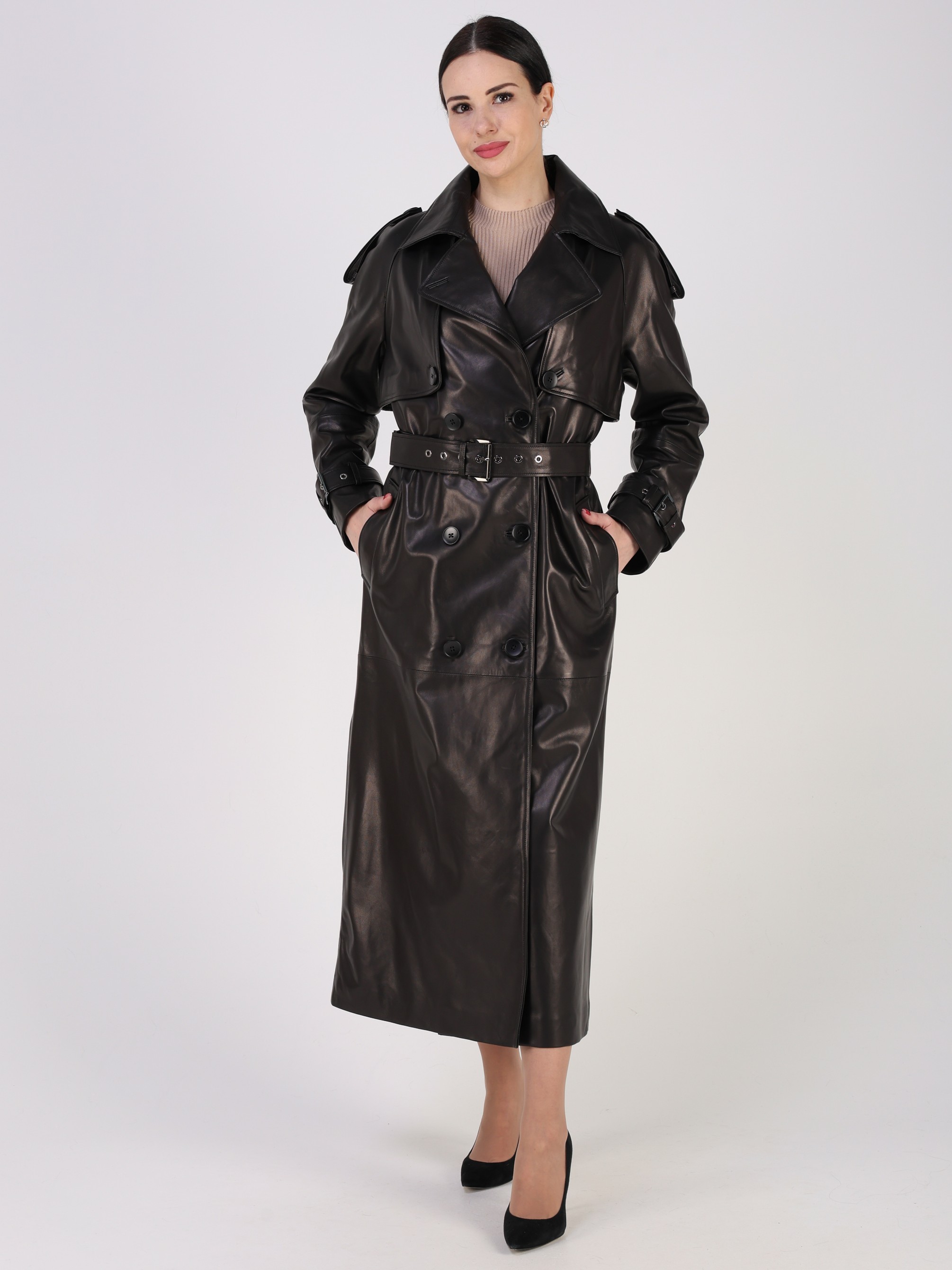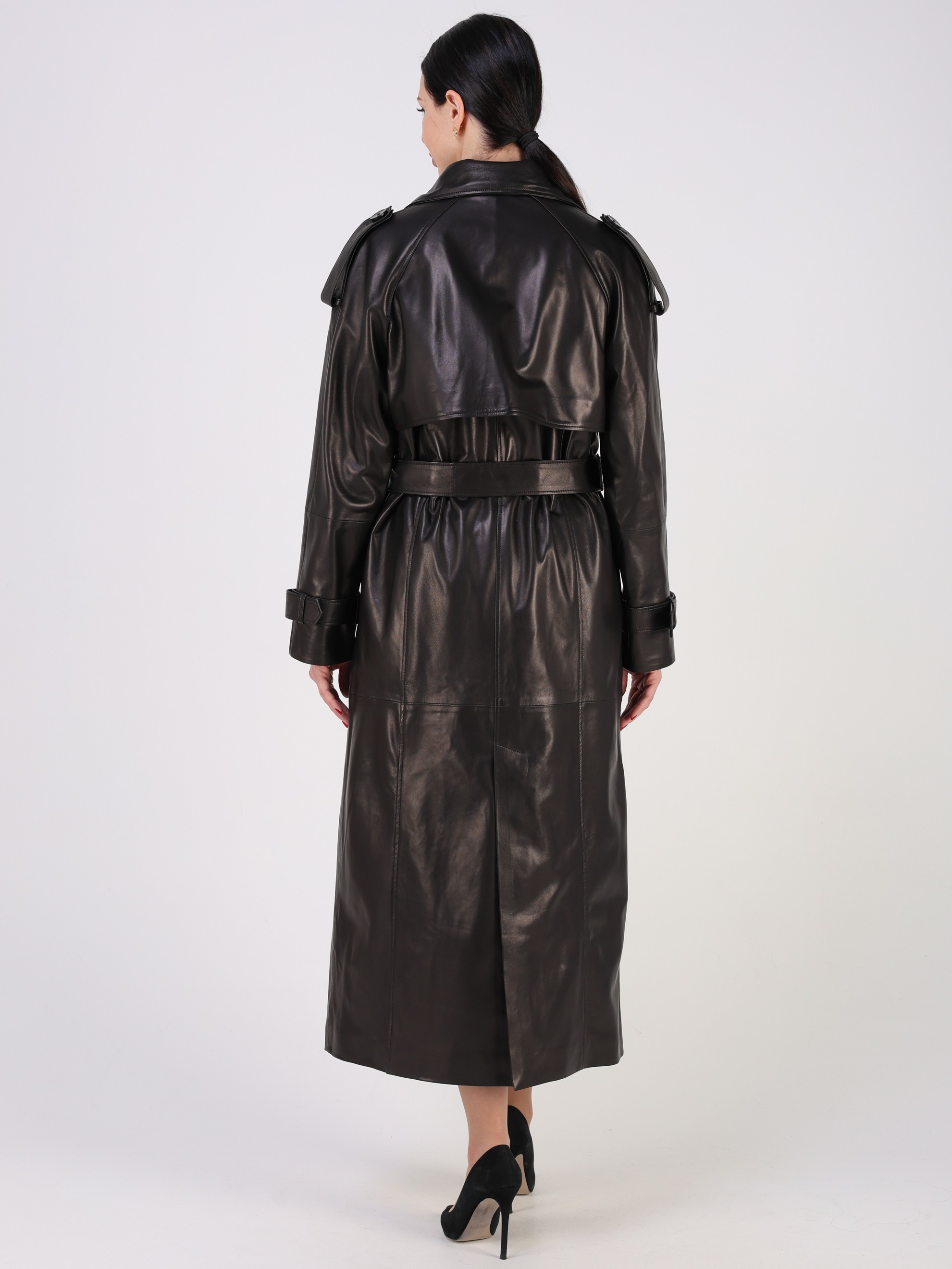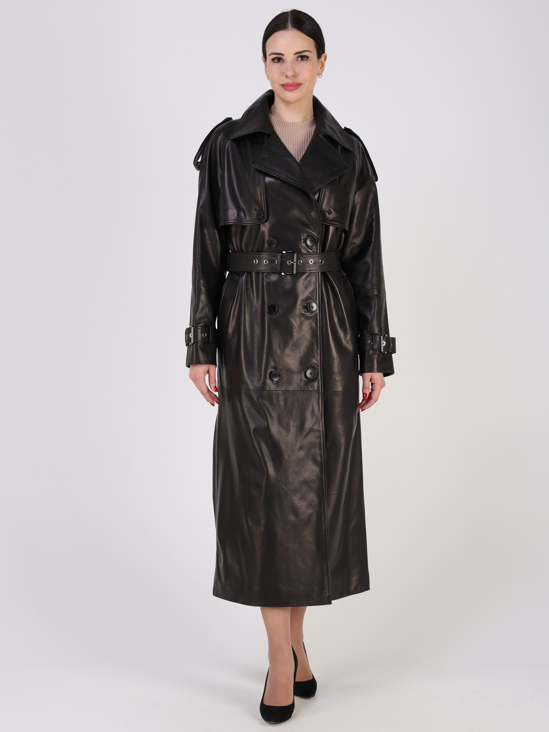 Тренчкот женский длинный выполнен из натуральной кожи ягненка. Тренч кожаный прямого кроя дополненная ремнем. Детали: двубортная застежка на пуговицах, глубокие карманы, погоны, рукав реглан с хлястиком, кокетка на спине, отлетная кокетка, классический воротник с лацканами, шлица.