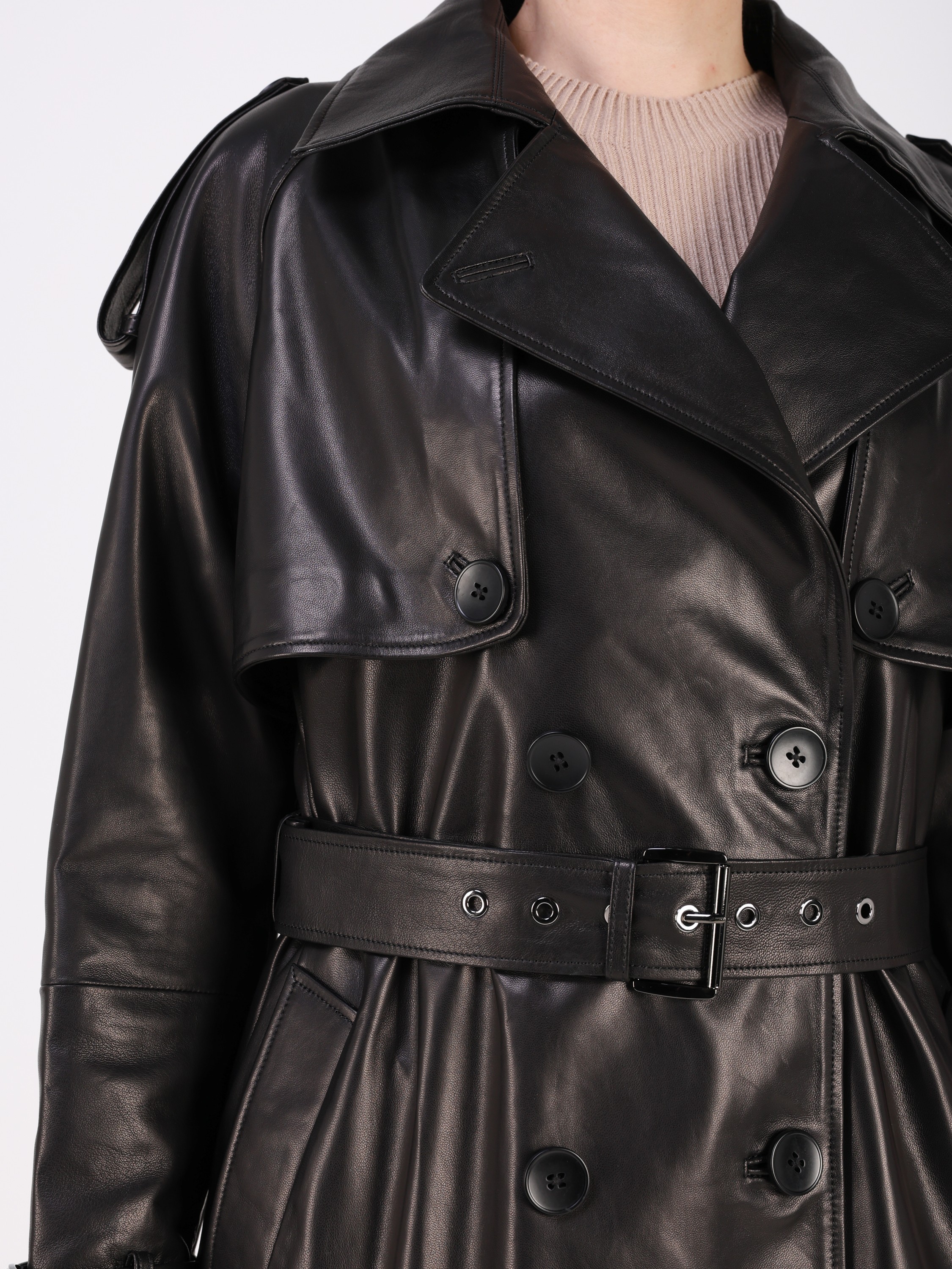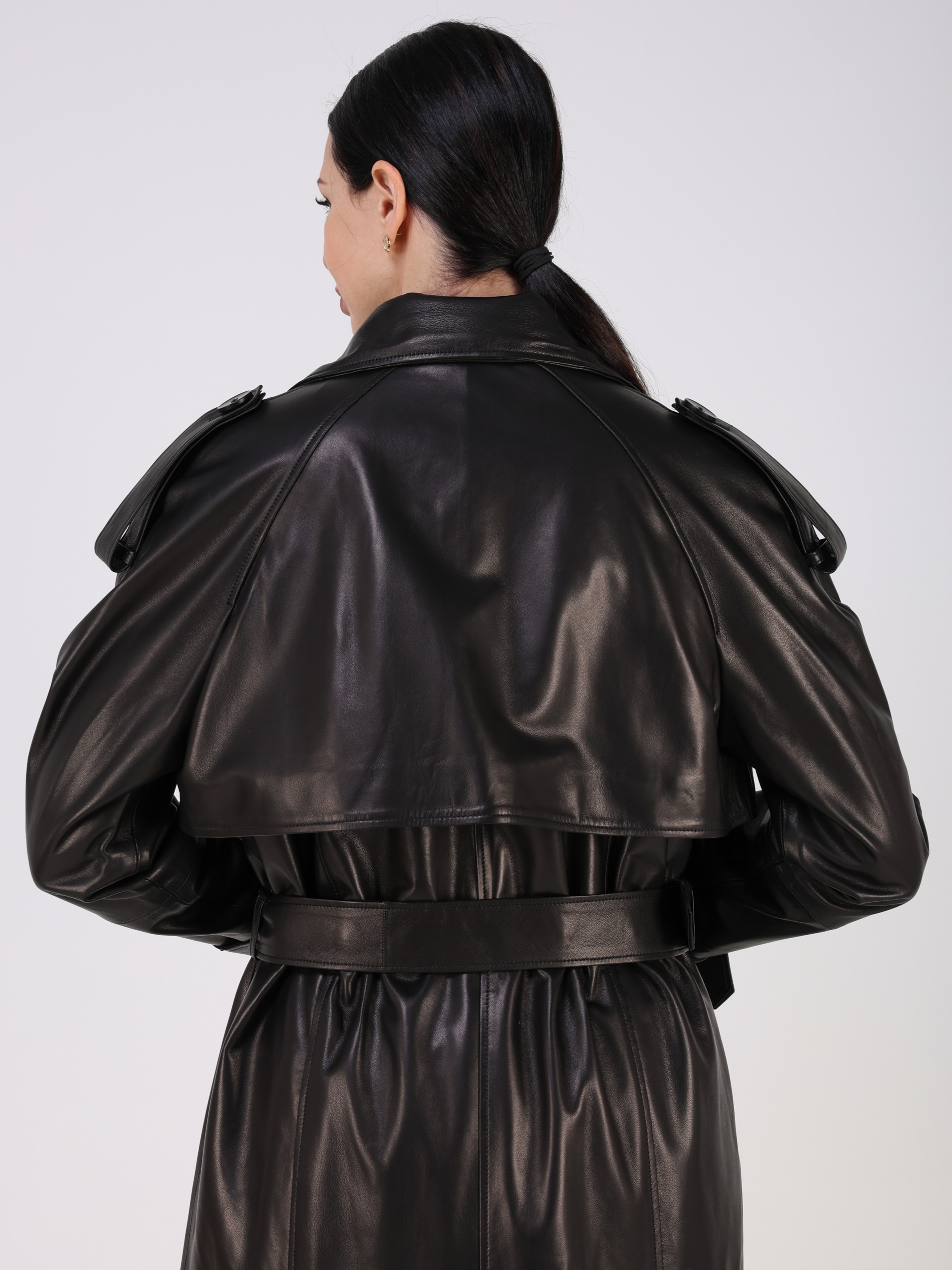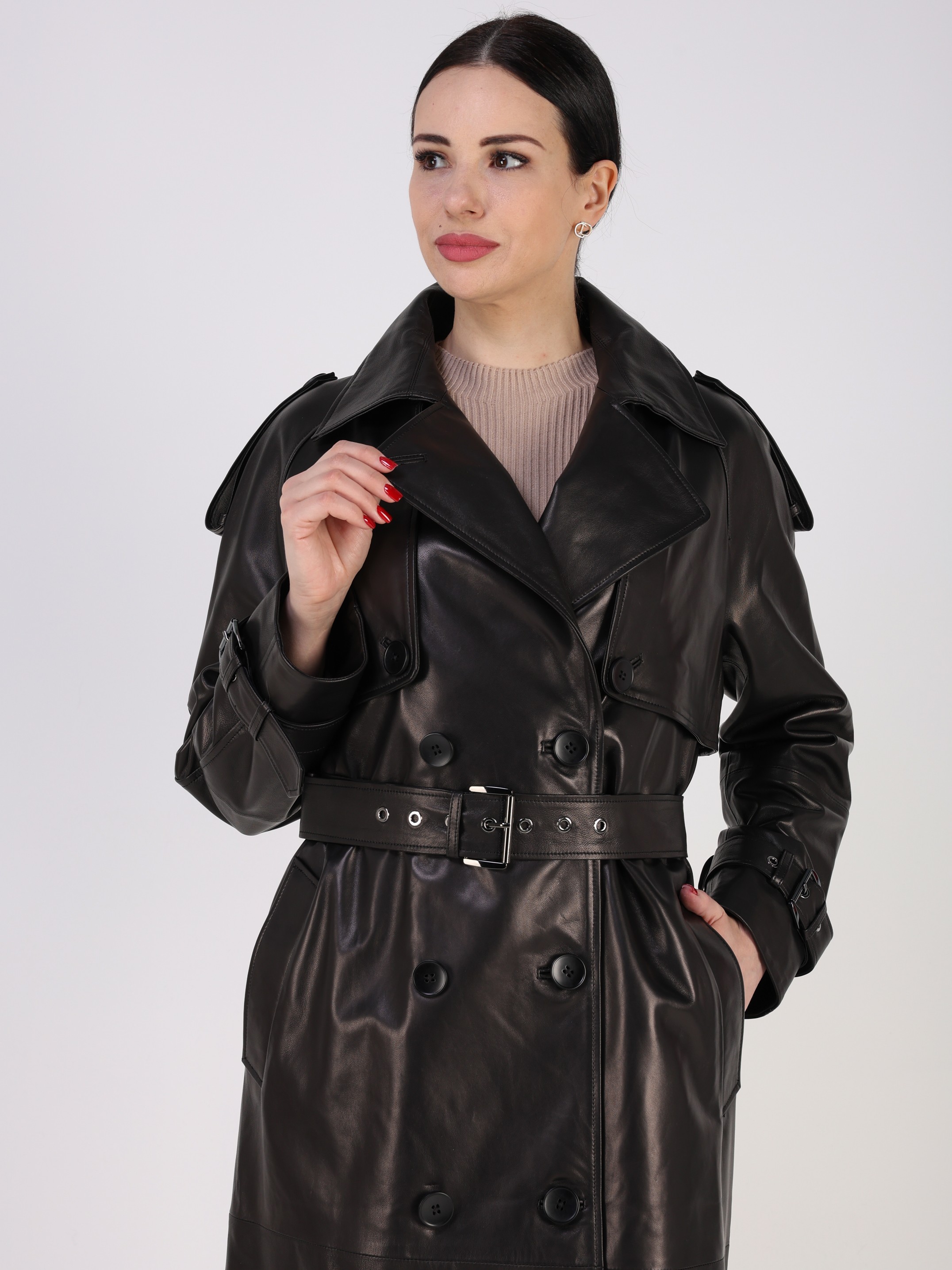 Тренчкот женский длинный выполнен из натуральной кожи ягненка. Тренч кожаный прямого кроя дополненная ремнем. Детали: двубортная застежка на пуговицах, глубокие карманы, погоны, рукав реглан с хлястиком, кокетка на спине, отлетная кокетка, классический воротник с лацканами, шлица.
