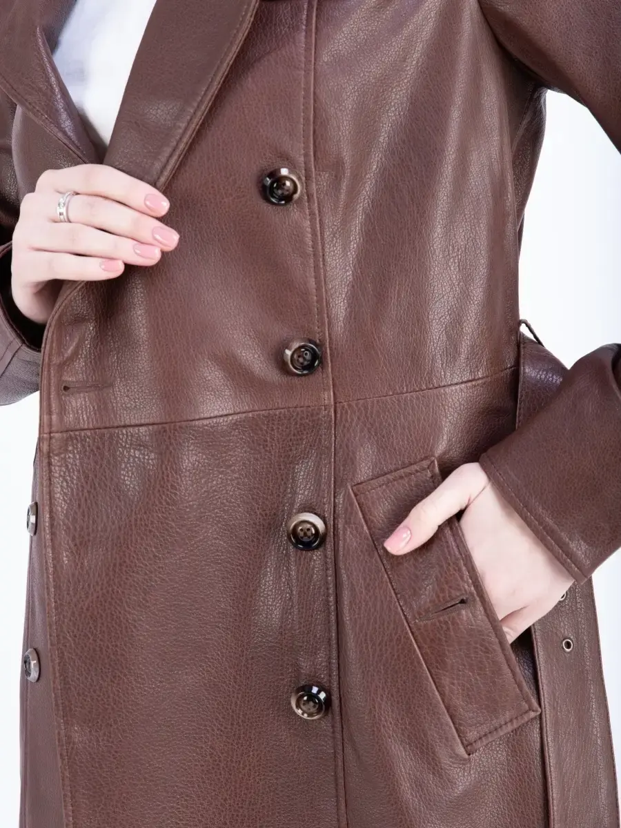 Элегантный и стильный кожаный тренчкот женский длинный из коллекции MONDIAL - стильная и качественная верхняя одежда, которая станет украшением ваших образов! Двубортная модель дополнена декоративными эполетами и поясом, который делает изделие прямого свободного кроя приталенным. Длинный демисезонный плащ женский на весну без утеплителя застегивается на пуговицы. Длина по спинке 100см. Он имеет два прорезных кармана по бокам и шлицу сзади. Кожаный тренч женский длинный сшит из плотной и мягкой, непромокаемой и непродуваемой натуральной кожи ягненка с мелкозернистой фактурой. Изнутри он отделан приятной к телу подкладкой. Практичная верхняя одежда с красивым дизайном станет настоящей находкой для базового гардероба взрослых женщин, девушек или подростков. Это хороший выбор для весны и осени или прохладного лета. Классическая модель с отложным английским воротом и погонами красиво сидит по фигуре, формируя женственный силуэт. Такая современная модная классика от турецкого производителя дополнит праздничные и сдержанные деловые или офисные образы, интересные молодежные луки в стиле оверсайз и кэжуал или наряд в стилистике олд мани. Легкий плащ летний из натуральной водоотталкивающей кожи премиум - качества станет замечательным выбором в качестве повседневной верхней одежды. В нем вам будет комфортно ходить на работу в офис или на учебу в школу, колледж и университет. Качественная брендовая вещь не даст замерзнуть или промокнуть под дождем в прохладные весенние, осенние месяцы или в летнюю непогоду. Она представлена в трендовом коричневом, черном и в других цветах и отлично смотрится на девушках высокого, среднего и невысокого роста. Размерная сетка включает большие плюс - сайз размеры, которые подойдут полным леди. Тренч длиной ниже колена можно надеть на выход или на простую вечернюю прогулку. Он отлично сочетается с обувью и аксессуарами в разных популярных стилях. У нас есть акции и распродажи, вы можете купить наши товары в подарок со скидкой!