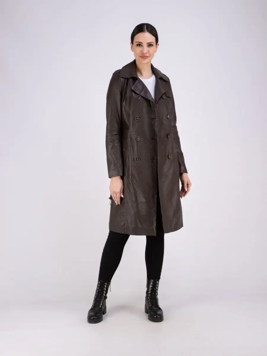Элегантный и стильный кожаный тренчкот женский длинный из коллекции MONDIAL - стильная и качественная верхняя одежда, которая станет украшением ваших образов! Двубортная модель дополнена декоративными эполетами и поясом, который делает изделие прямого свободного кроя приталенным. Длинный демисезонный плащ женский на весну без утеплителя застегивается на пуговицы. Длина по спинке 100см. Он имеет два прорезных кармана по бокам и шлицу сзади. Кожаный тренч женский длинный сшит из плотной и мягкой, непромокаемой и непродуваемой натуральной кожи ягненка с мелкозернистой фактурой. Изнутри он отделан приятной к телу подкладкой. Практичная верхняя одежда с красивым дизайном станет настоящей находкой для базового гардероба взрослых женщин, девушек или подростков. Это хороший выбор для весны и осени или прохладного лета. Классическая модель с отложным английским воротом и погонами красиво сидит по фигуре, формируя женственный силуэт. Такая современная модная классика от турецкого производителя дополнит праздничные и сдержанные деловые или офисные образы, интересные молодежные луки в стиле оверсайз и кэжуал или наряд в стилистике олд мани. Легкий плащ летний из натуральной водоотталкивающей кожи премиум - качества станет замечательным выбором в качестве повседневной верхней одежды. В нем вам будет комфортно ходить на работу в офис или на учебу в школу, колледж и университет. Качественная брендовая вещь не даст замерзнуть или промокнуть под дождем в прохладные весенние, осенние месяцы или в летнюю непогоду. Она представлена в трендовом коричневом, черном и в других цветах и отлично смотрится на девушках высокого, среднего и невысокого роста. Размерная сетка включает большие плюс - сайз размеры, которые подойдут полным леди. Тренч длиной ниже колена можно надеть на выход или на простую вечернюю прогулку. Он отлично сочетается с обувью и аксессуарами в разных популярных стилях. У нас есть акции и распродажи, вы можете купить наши товары в подарок со скидкой!
