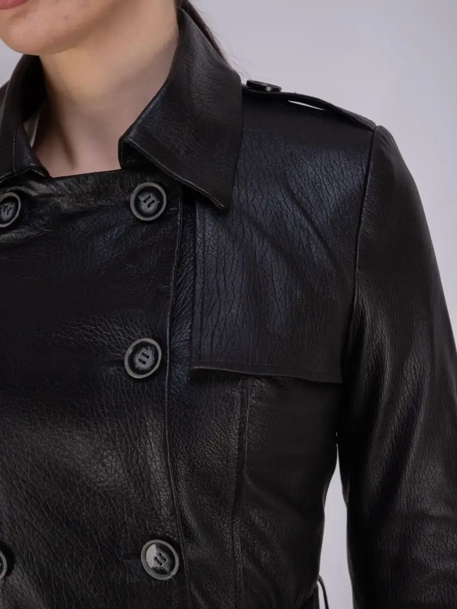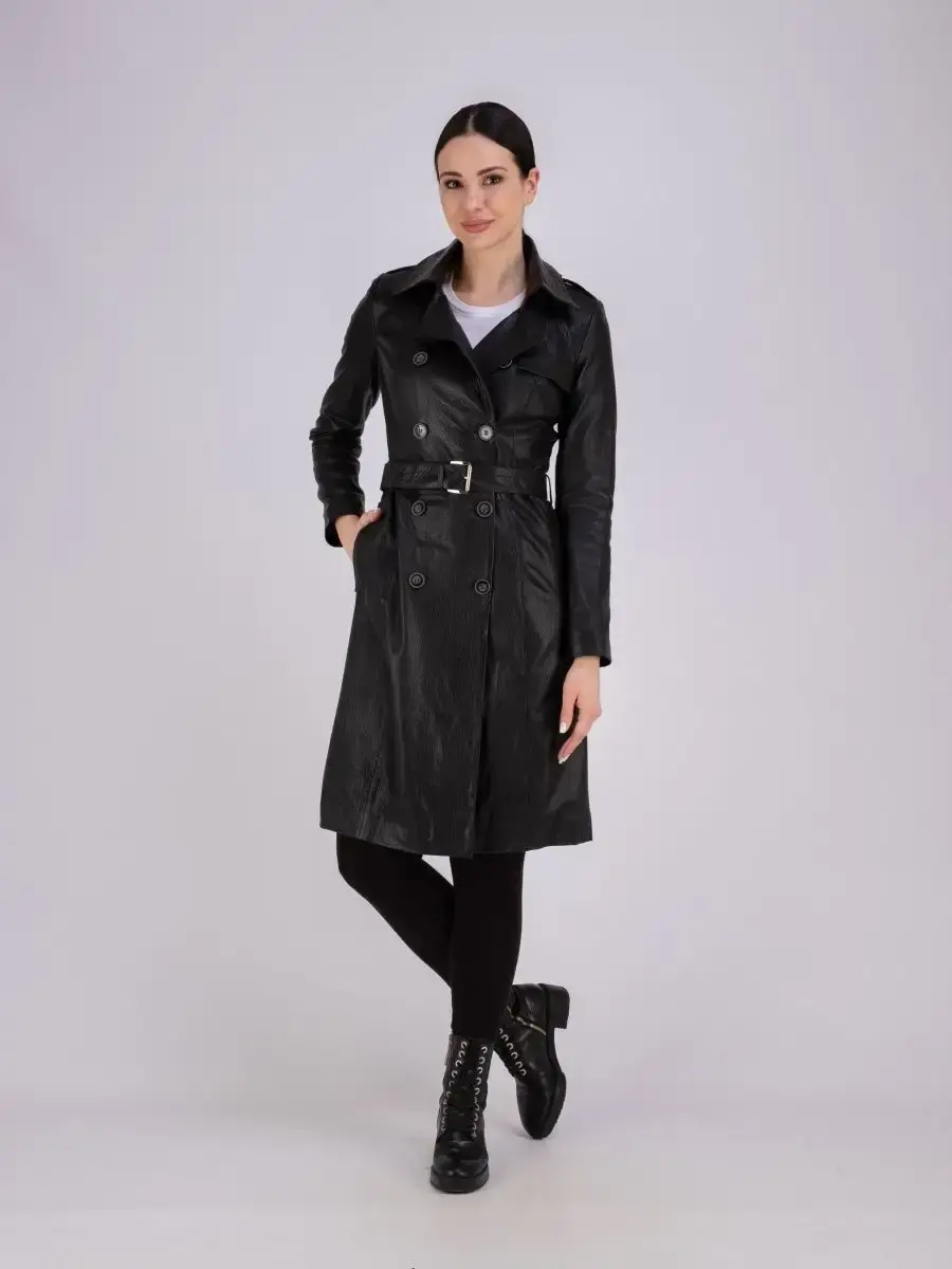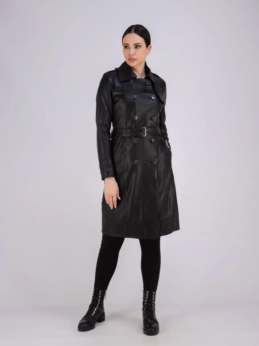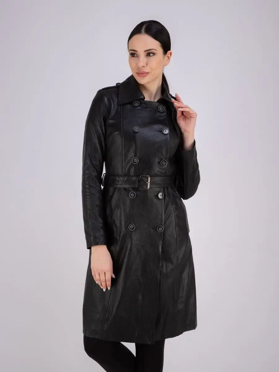 Элегантный и стильный кожаный тренчкот женский длинный из коллекции MONDIAL - стильная и качественная верхняя одежда, которая станет украшением ваших образов! Двубортная модель дополнена декоративными эполетами и поясом, который делает изделие прямого свободного кроя приталенным. Длинный демисезонный плащ женский на весну без утеплителя застегивается на пуговицы. Длина по спинке 100см. Он имеет два прорезных кармана по бокам и шлицу сзади. Кожаный тренч женский длинный сшит из плотной и мягкой, непромокаемой и непродуваемой натуральной кожи ягненка с мелкозернистой фактурой. Изнутри он отделан приятной к телу подкладкой. Практичная верхняя одежда с красивым дизайном станет настоящей находкой для базового гардероба взрослых женщин, девушек или подростков. Это хороший выбор для весны и осени или прохладного лета. Классическая модель с отложным английским воротом и погонами красиво сидит по фигуре, формируя женственный силуэт. Такая современная модная классика от турецкого производителя дополнит праздничные и сдержанные деловые или офисные образы, интересные молодежные луки в стиле оверсайз и кэжуал или наряд в стилистике олд мани. Легкий плащ летний из натуральной водоотталкивающей кожи премиум - качества станет замечательным выбором в качестве повседневной верхней одежды. В нем вам будет комфортно ходить на работу в офис или на учебу в школу, колледж и университет. Качественная брендовая вещь не даст замерзнуть или промокнуть под дождем в прохладные весенние, осенние месяцы или в летнюю непогоду. Она представлена в трендовом коричневом, черном и в других цветах и отлично смотрится на девушках высокого, среднего и невысокого роста. Размерная сетка включает большие плюс - сайз размеры, которые подойдут полным леди. Тренч длиной ниже колена можно надеть на выход или на простую вечернюю прогулку. Он отлично сочетается с обувью и аксессуарами в разных популярных стилях. У нас есть акции и распродажи, вы можете купить наши товары в подарок со скидкой!