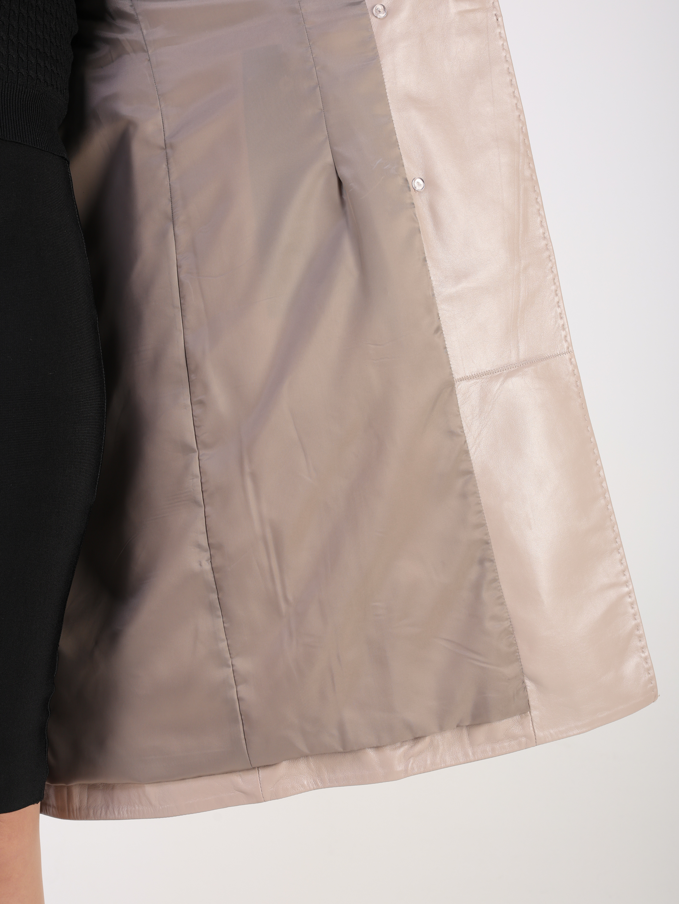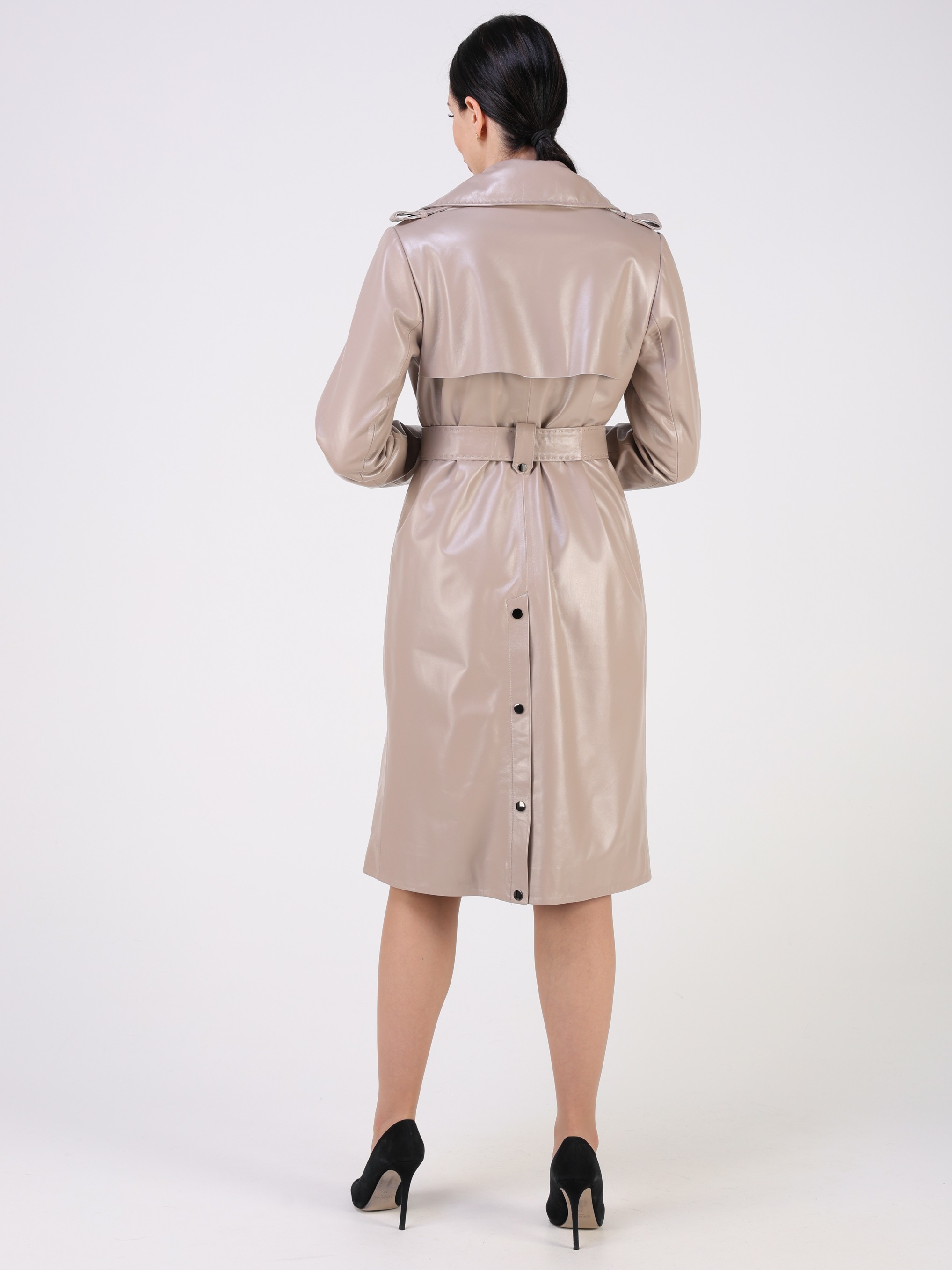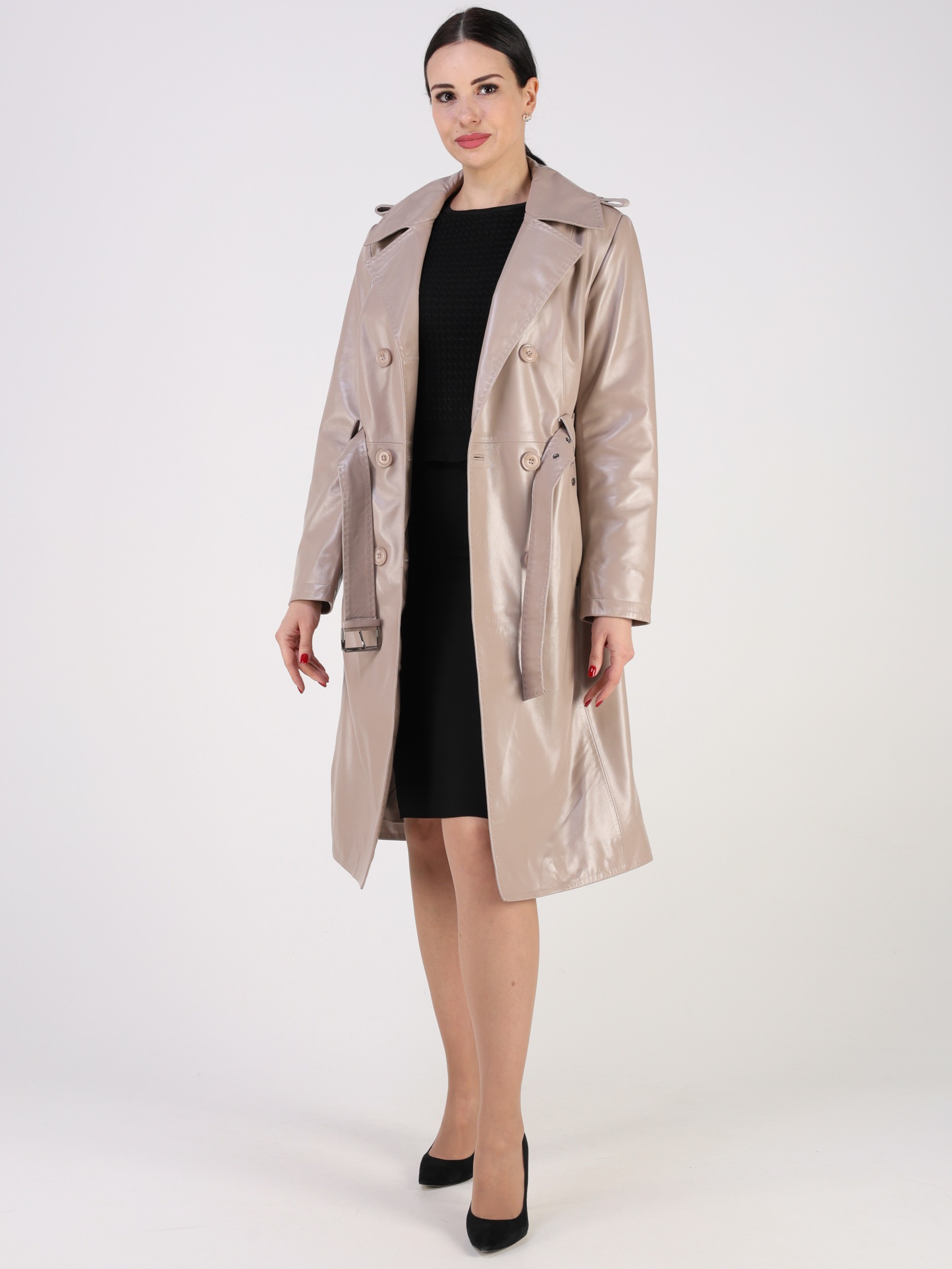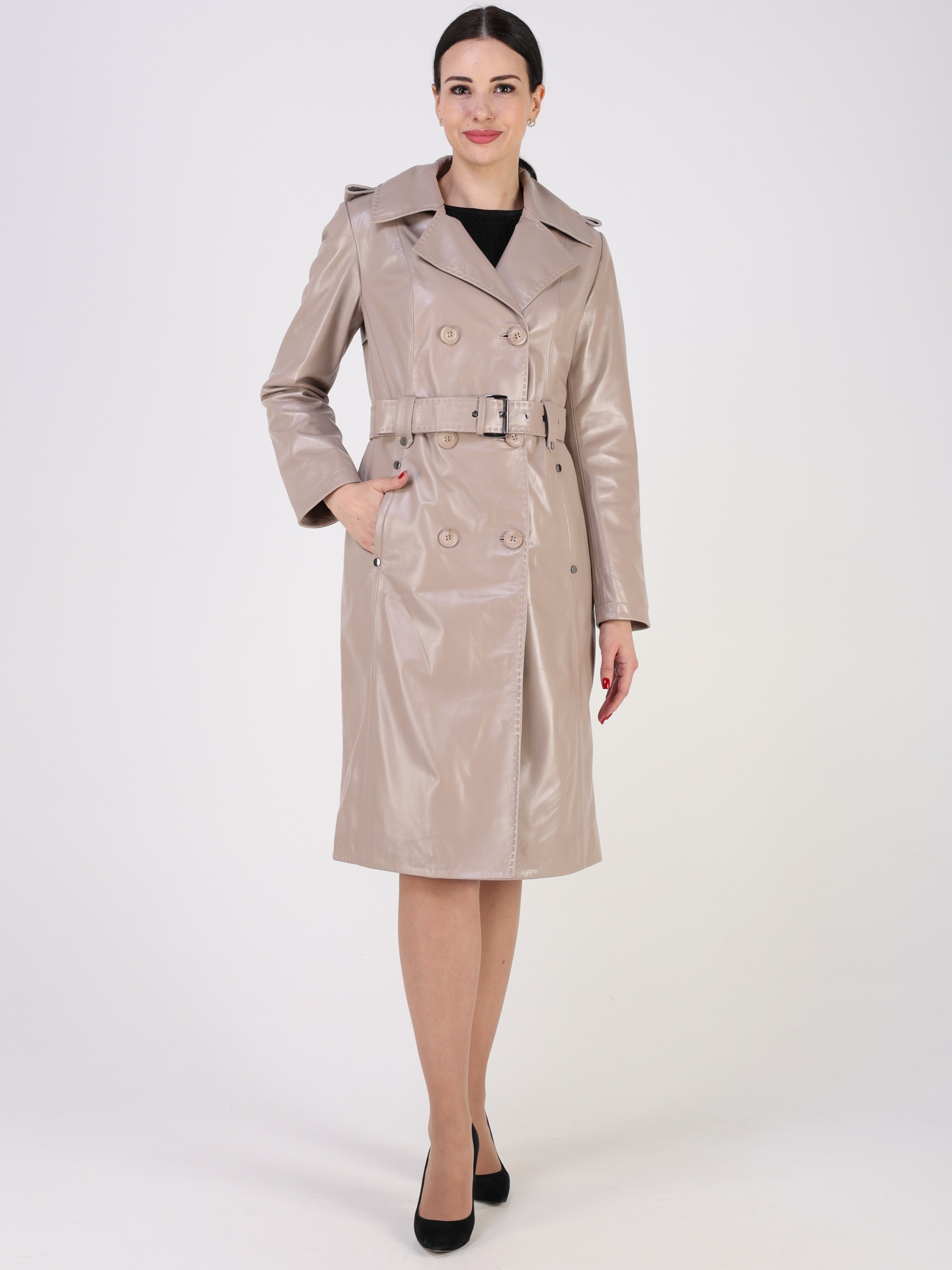 Тренчкот женский выполнен из натуральной кожи выделки "плонже". Модель прямого кроя дополненная ремнем. Детали: двубортная застежка на пуговицы, 2 кармана, погоны, кокетка на спине, отложной воротник с лацканами, шлица на кнопках, декоративные хольнитены и строчки.
