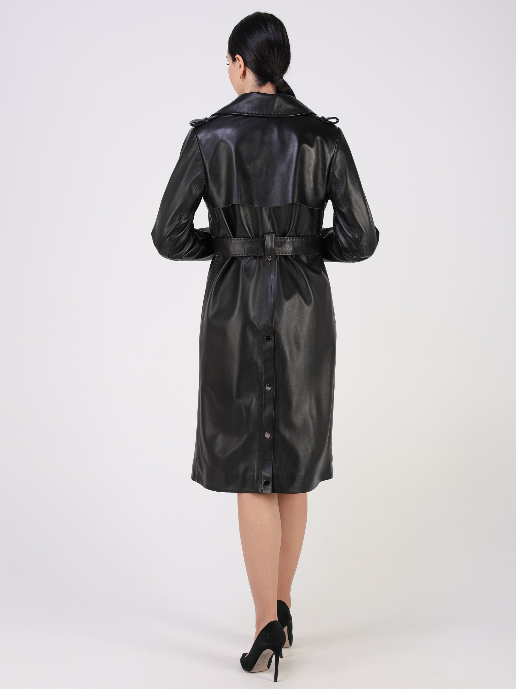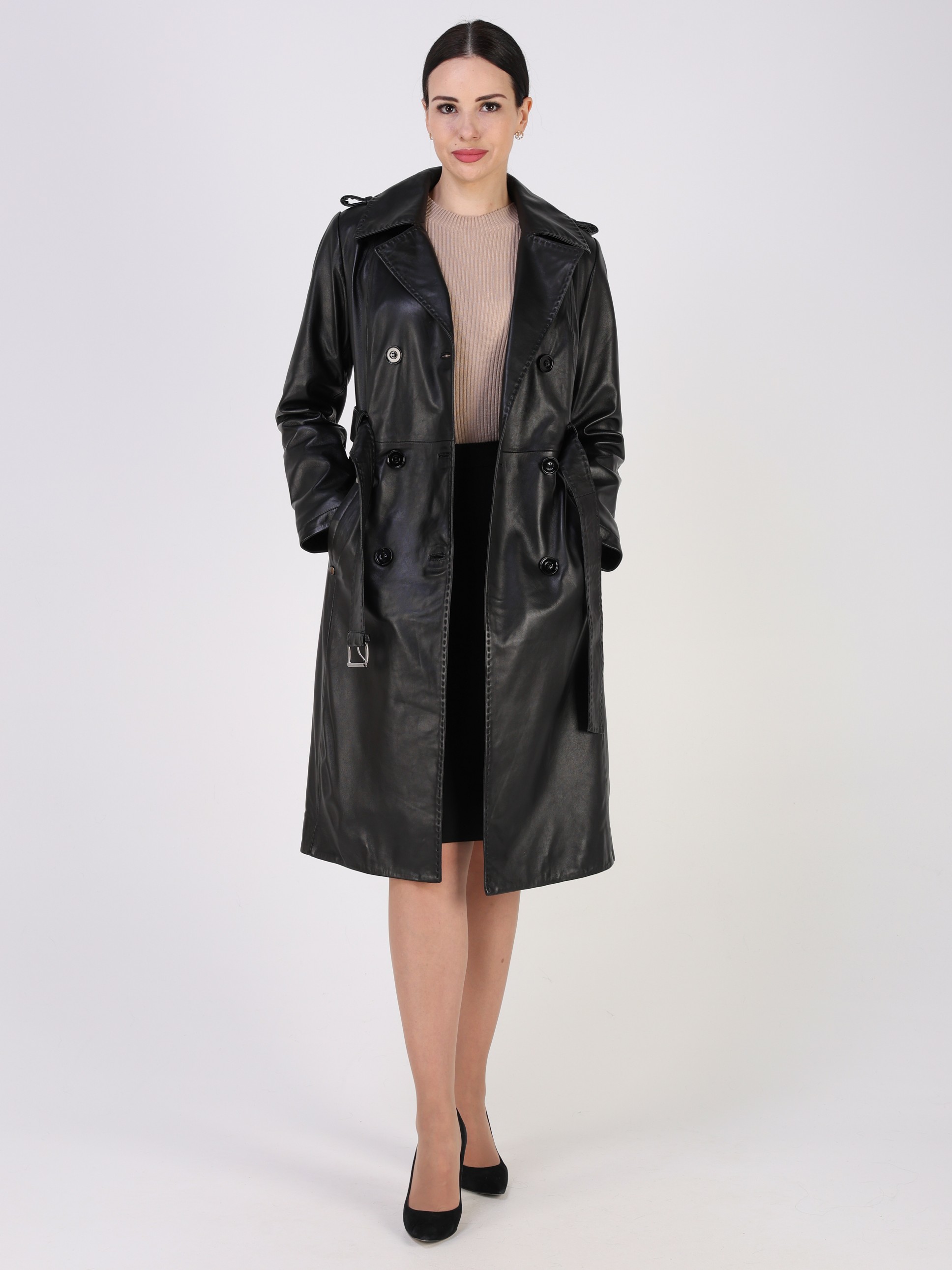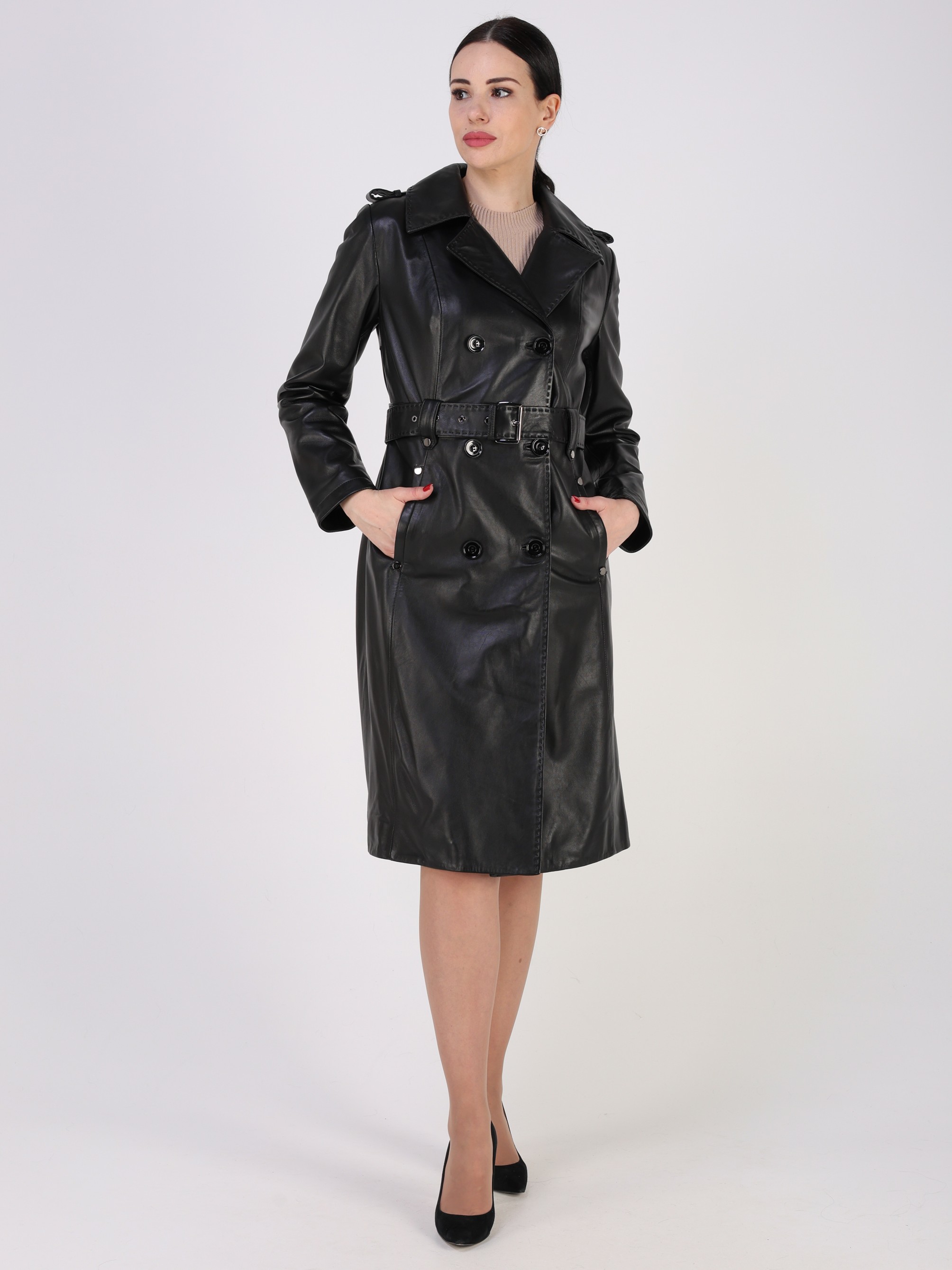 Тренчкот женский выполнен из натуральной кожи выделки "плонже". Модель прямого кроя дополненная ремнем. Детали: двубортная застежка на пуговицы, 2 кармана, погоны, кокетка на спине, отложной воротник с лацканами, шлица на кнопках, декоративные хольнитены и строчки.