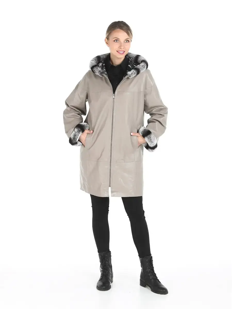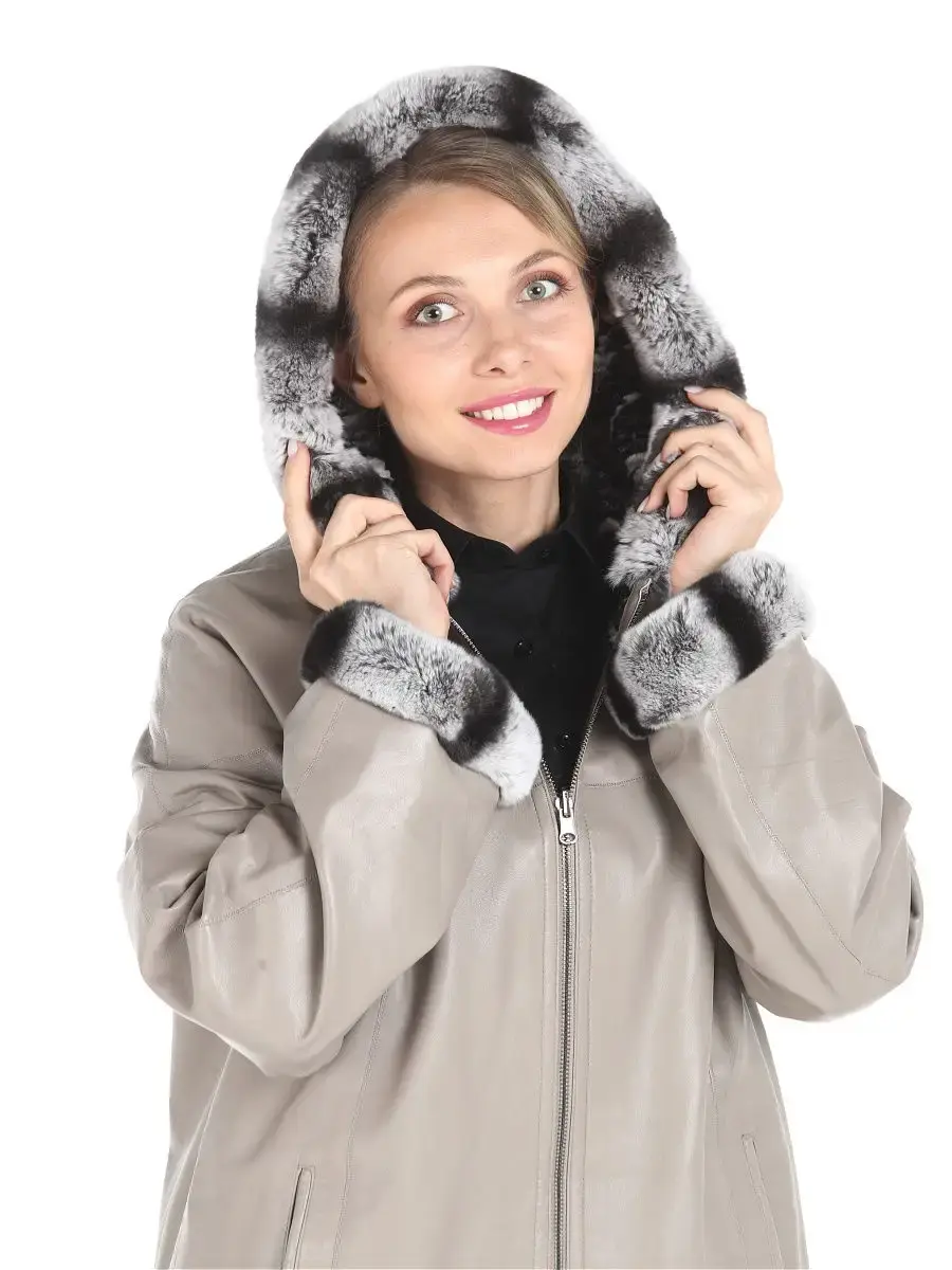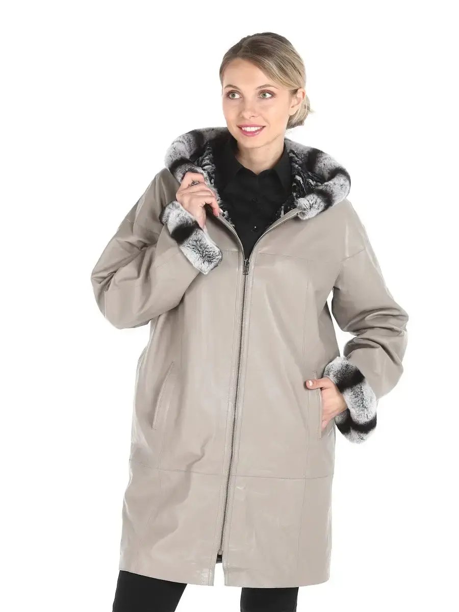 Женское двустороннее пальто из 100% натуральной кожи ягненка. Капюшон - несъёмный. Опушка на капюшоне и рукавах несъемный, из натурального меха кролика - рекс. Подкладка - обратная сторона из искусственного меха. MONDIAL Производство Турция.