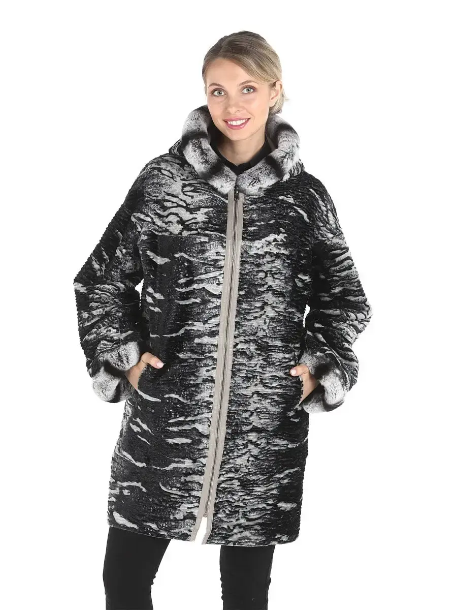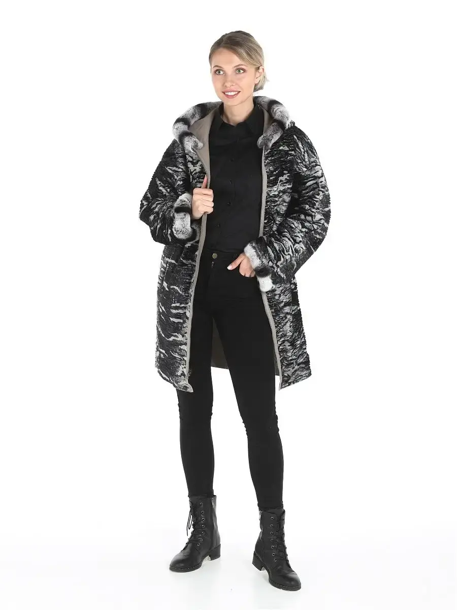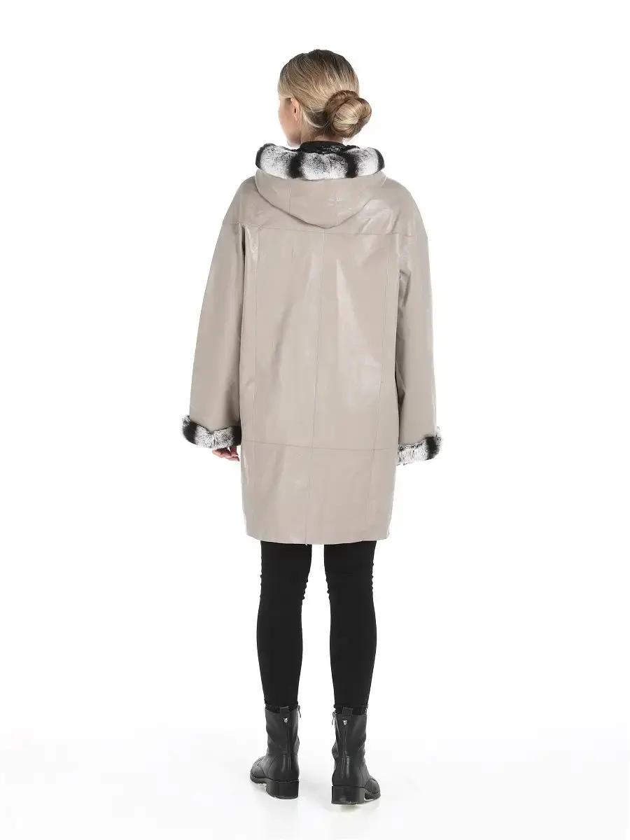 Женское двустороннее пальто из 100% натуральной кожи ягненка. Капюшон - несъёмный. Опушка на капюшоне и рукавах несъемный, из натурального меха кролика - рекс. Подкладка - обратная сторона из искусственного меха. MONDIAL Производство Турция.